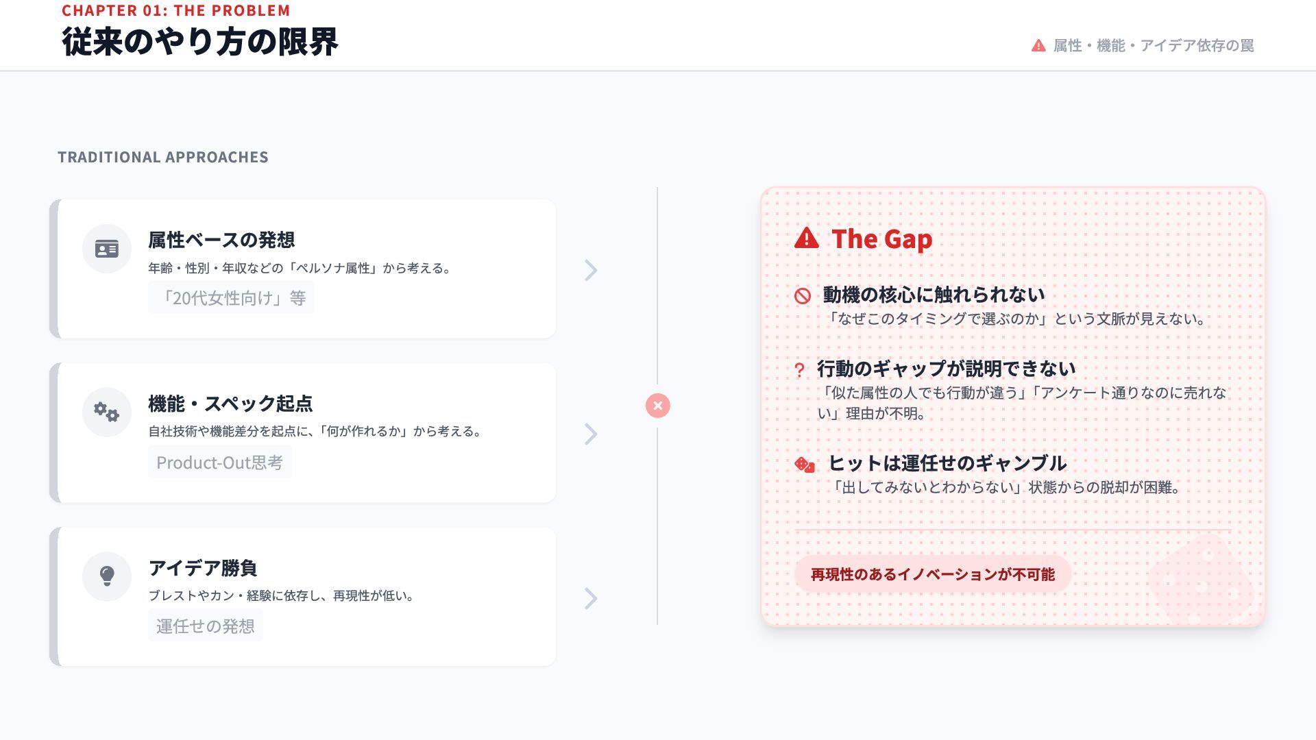 属性ベースの発想 年齢・性別・年収などの「ペルソナ属性」から考える。 「20代女性向け」等 機能・スペック起点 自社技術や機能差分を起点に、 「何が作れるか」から考える。 Product-Out思考 アイデア勝負 ブレストやカン・経験に依存し、再現性が低い。 運任せの発想 The Gap 動機の核心に触れられない 「なぜこのタイミングで選ぶのか」という文脈が見えない。 ? 行動のギャップが説明できない 「似た属性の人でも行動が違う」 「アンケート通りなのに売れな い」理由が不明。 ヒットは運任せのギャンブル 「出してみないとわからない」状態からの脱却が困難。 再現性のあるイノベーションが不可能