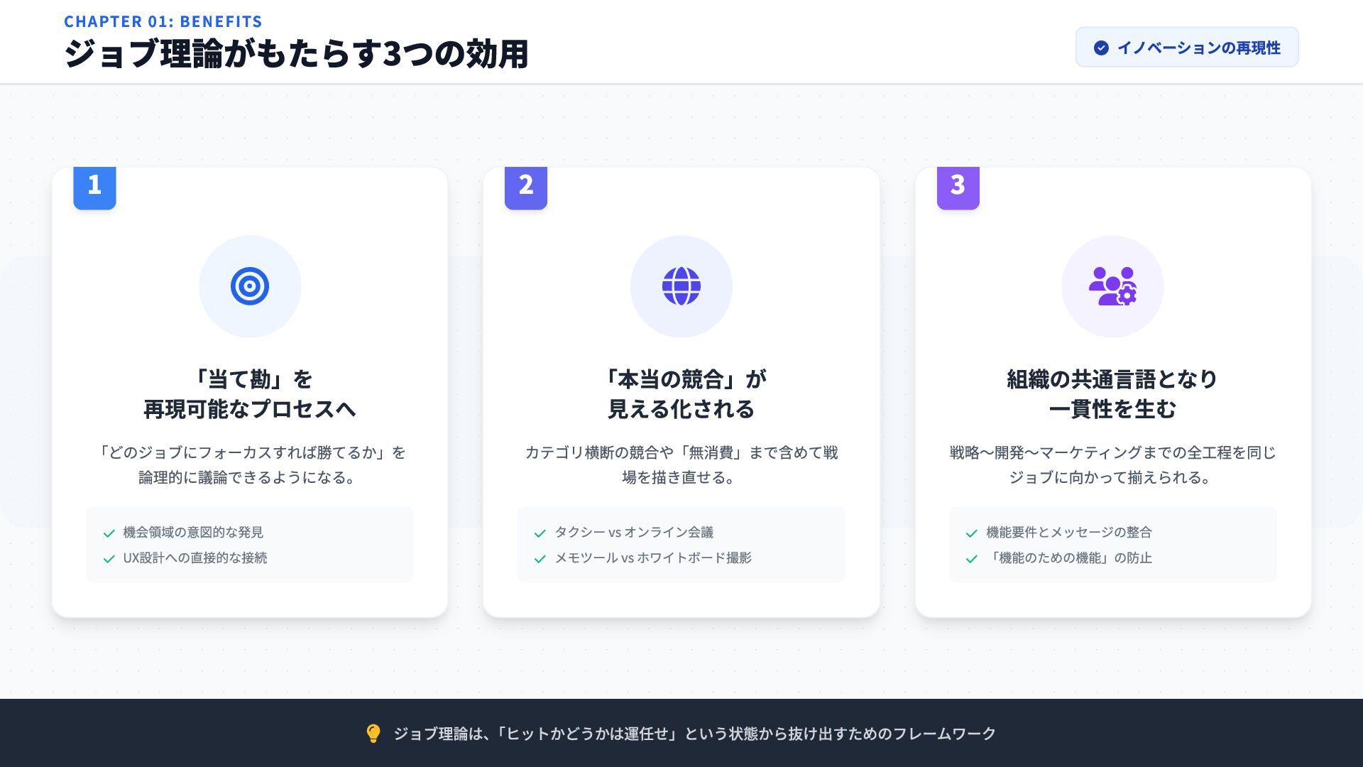ジョブ理論は、 「ヒットかどうかは運任せ」という状態から抜け出すためのフレームワーク CHAPTER 01: BENEFITS ジョブ理論がもたらす3つの効用 イノベーションの再現性