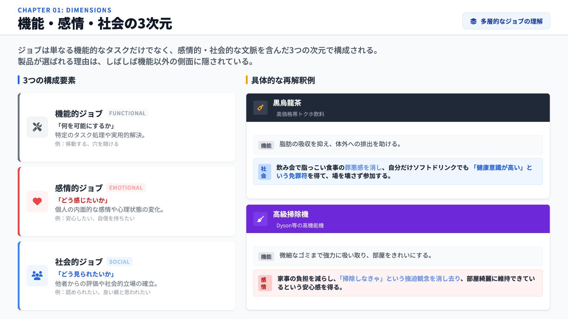 感情的ジョブ EMOTIONAL 「どう感じたいか」 個人の内面的な感情や心理状態の変化。 例:安心したい、自信を持ちたい 社会的ジョブ SOCIAL 「どう見られたいか」 他者からの評価や社会的立場の確立。 例:認められたい、良い親と思われたい 具体的な再解釈例 黒烏龍茶 高価格帯トクホ飲料 機能 脂肪の吸収を抑え、体外への排出を助ける。 社 会 飲み会で脂っこい食事の罪悪感を消し、自分だけソフトドリンクでも 「健康意識が高い」と いう免罪符を得て、場を壊さず参加する。 高級掃除機 Dyson等の高機能機 機能 微細なゴミまで強力に吸い取り、部屋をきれいにする。 感 情 家事の負担を減らし、 「掃除しなきゃ」という強迫観念を消し去り、部屋綺麗に維持できてい るという安心感を得る。 CHAPTER 01: DIMENSIONS 機能・感情・社会の3次元 多層的なジョブの理解