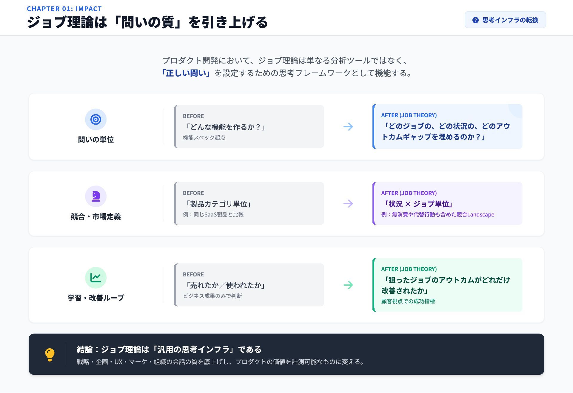 「製品カテゴリ単位」 例:同じSaaS製品と比較 学習・改善ループ BEFORE 「売れたか/使われたか」 ビジネス成果のみで判断 結論:ジョブ理論は「汎用の思考インフラ」である 戦略・企画・UX・マーケ・組織の会話の質を底上げし、プロダクトの価値を計測可能なものに変える。 AFTER (JOB THEORY) 「どのジョブの、どの状況の、どのアウ トカムギャップを埋めるのか?」 AFTER (JOB THEORY) 「状況 × ジョブ単位」 例:無消費や代替行動も含めた競合Landscape AFTER (JOB THEORY) 「狙ったジョブのアウトカムがどれだけ 改善されたか」 顧客視点での成功指標 CHAPTER 01: IMPACT ジョブ理論は「問いの質」を引き上げる 思考インフラの転換