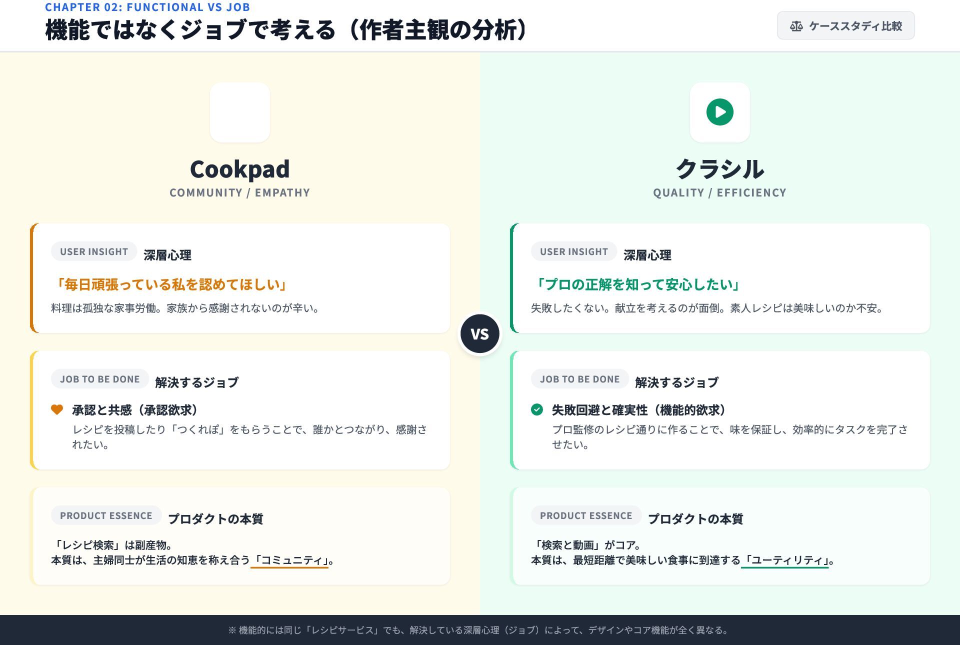 料理は孤独な家事労働。家族から感謝されないのが辛い。 JOB TO BE DONE 解決するジョブ 承認と共感(承認欲求) レシピを投稿したり「つくれぽ」をもらうことで、誰かとつながり、感謝さ れたい。 PRODUCT ESSENCE プロダクトの本質 「レシピ検索」は副産物。 本質は、主婦同士が生活の知恵を称え合う「コミュニティ」 。 クラシル QUALITY / EFFICIENCY USER INSIGHT 深層心理 「プロの正解を知って安心したい」 失敗したくない。献立を考えるのが面倒。素人レシピは美味しいのか不安。 JOB TO BE DONE 解決するジョブ 失敗回避と確実性(機能的欲求) プロ監修のレシピ通りに作ることで、味を保証し、効率的にタスクを完了さ せたい。 PRODUCT ESSENCE プロダクトの本質 「検索と動画」がコア。 本質は、最短距離で美味しい食事に到達する「ユーティリティ」 。 CHAPTER 02: FUNCTIONAL VS JOB 機能ではなくジョブで考える(作者主観の分析) ケーススタディ比較 VS