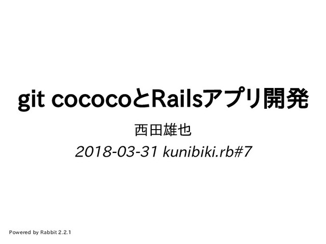 git cococoとRailsアプリ開発 西田雄也 2018-03-31 kunibiki.rb#7 Powered by Rabbit 2.2.1