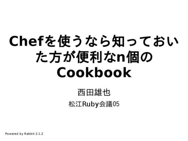 Chefを使うなら知っておい た方が便利なn個の Cookbook 西田雄也 松江Ruby会議05 Powered by Rabbit 2.1.2