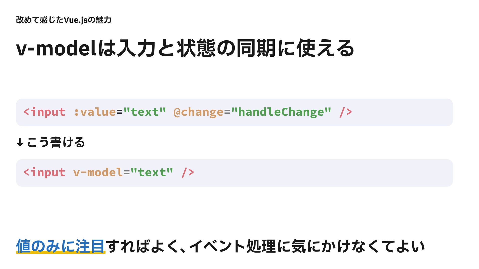 վΊͯײͨ͡7VFKTͷັྗ WNPEFMೖྗͱঢ়ଶͷಉظʹ͑Δ ͷΈʹ͢ΕΑ͘ɺ Πϕϯτॲཧʹؾʹ͔͚ͳͯ͘Α͍ ˣ͜͏ॻ͚Δ <input :value="text" @change="handleChange" /> <input