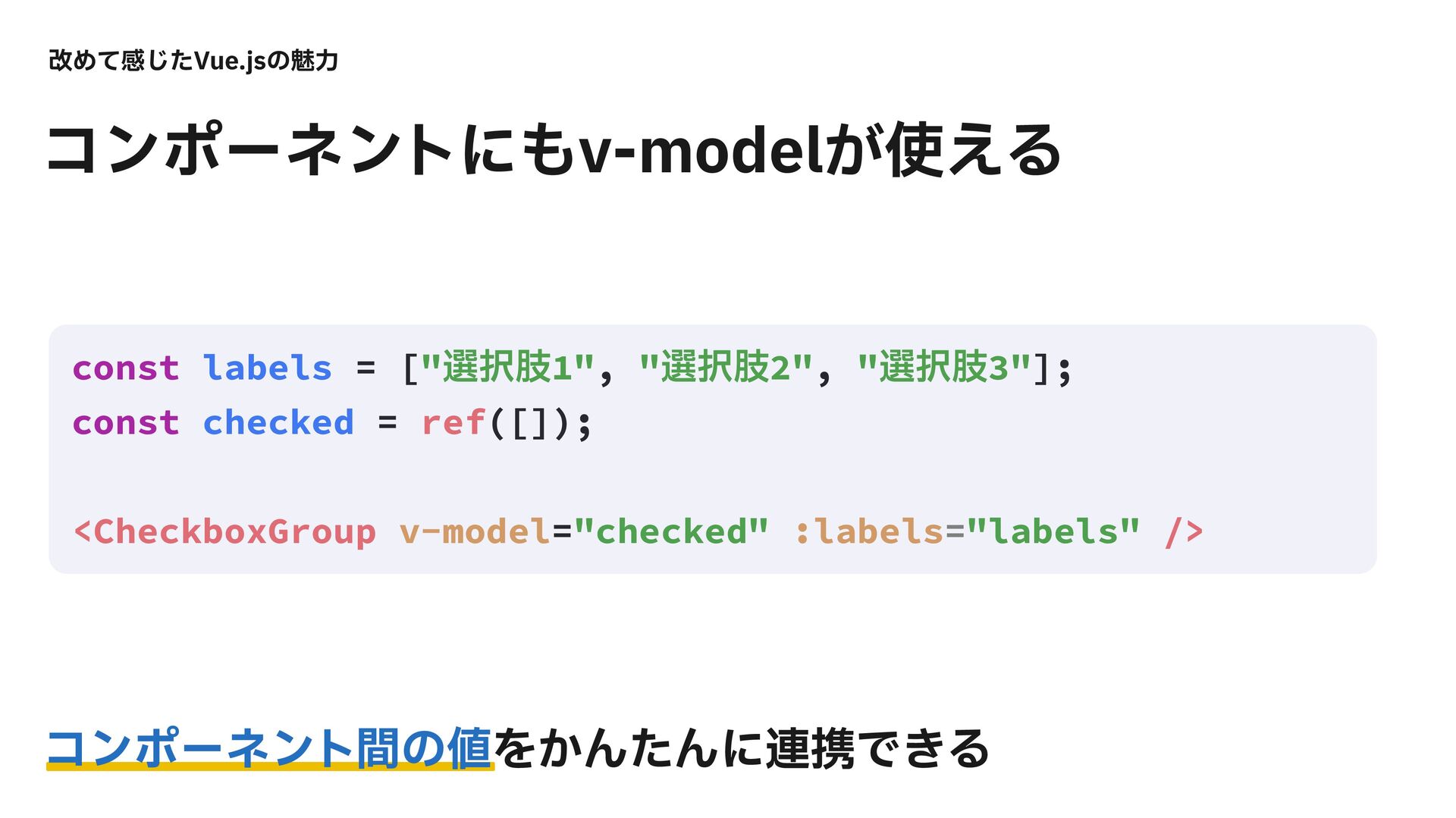 վΊͯײͨ͡7VFKTͷັྗ ίϯϙʔωϯτؒͷΛ͔ΜͨΜʹ࿈ܞͰ͖Δ ίϯϙʔωϯτʹWNPEFM͕͑Δ const labels = ["બࢶ1", "બࢶ2", "બࢶ3"]; const