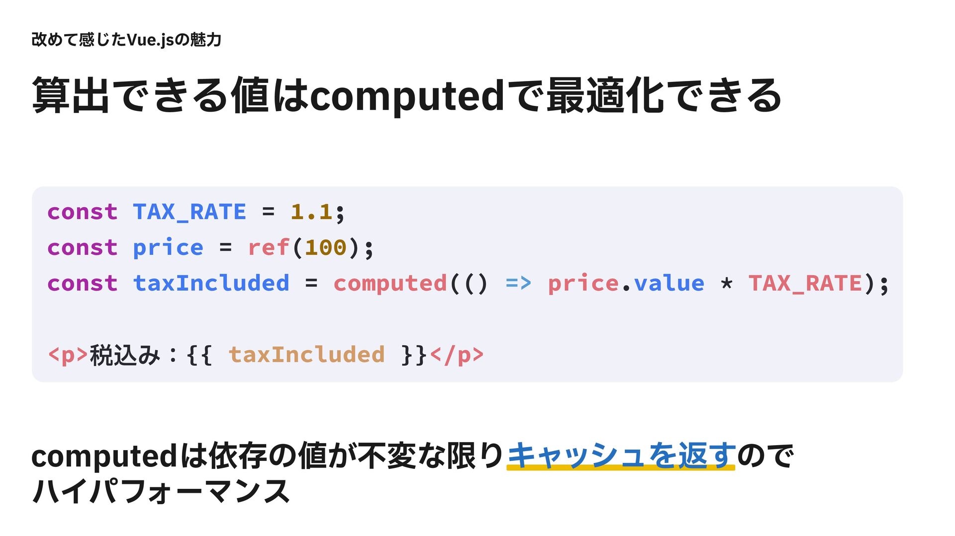= computed(() => price.value * TAX_RATE); <p>੫ࠐΈɿ{{ taxIncluded }}</p> վΊͯײͨ͡7VFKTͷັྗ DPNQVUFEґଘͷ͕ෆมͳݶΓΩϟογϡΛฦ͢ͷͰ ϋΠύϑΥʔϚϯε ࢉग़Ͱ͖ΔDPNQVUFEͰ࠷దԽͰ͖Δ