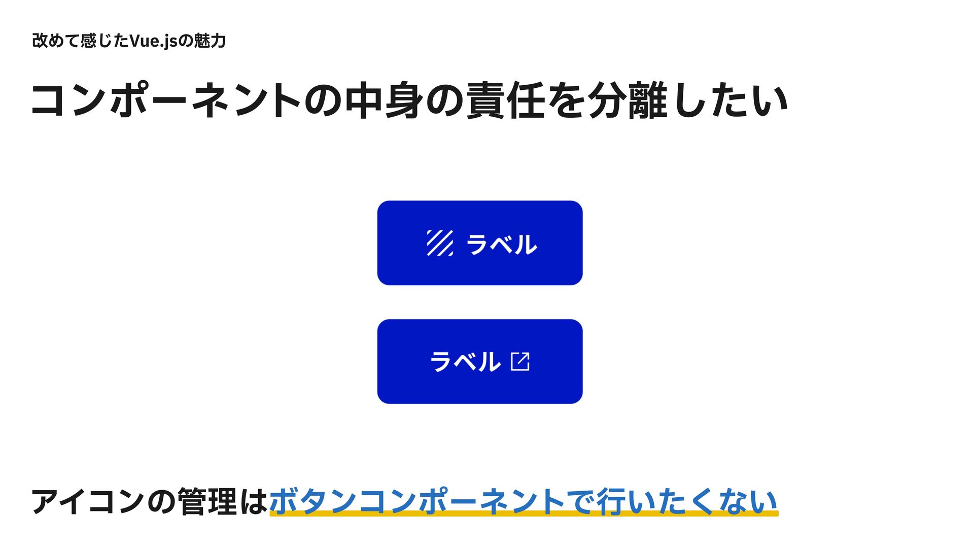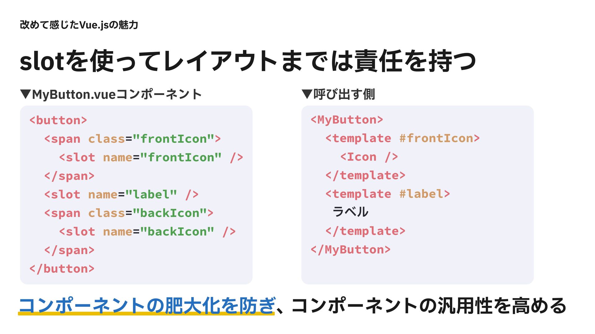 <span class="backIcon"> <slot name="backIcon" /> </span> </button> <MyButton> <template #frontIcon> <Icon /> </template> <template #label> ϥϕϧ </template> </MyButton> վΊͯײͨ͡7VFKTͷັྗ ˝.Z#VUUPOWVFίϯϙʔωϯτ ˝ݺͼग़͢ଆ TMPUΛͬͯϨΠΞτ·ͰΛ࣋ͭ ίϯϙʔωϯτͷංେԽΛ͗ɺ ίϯϙʔωϯτͷ൚༻ੑΛߴΊΔ