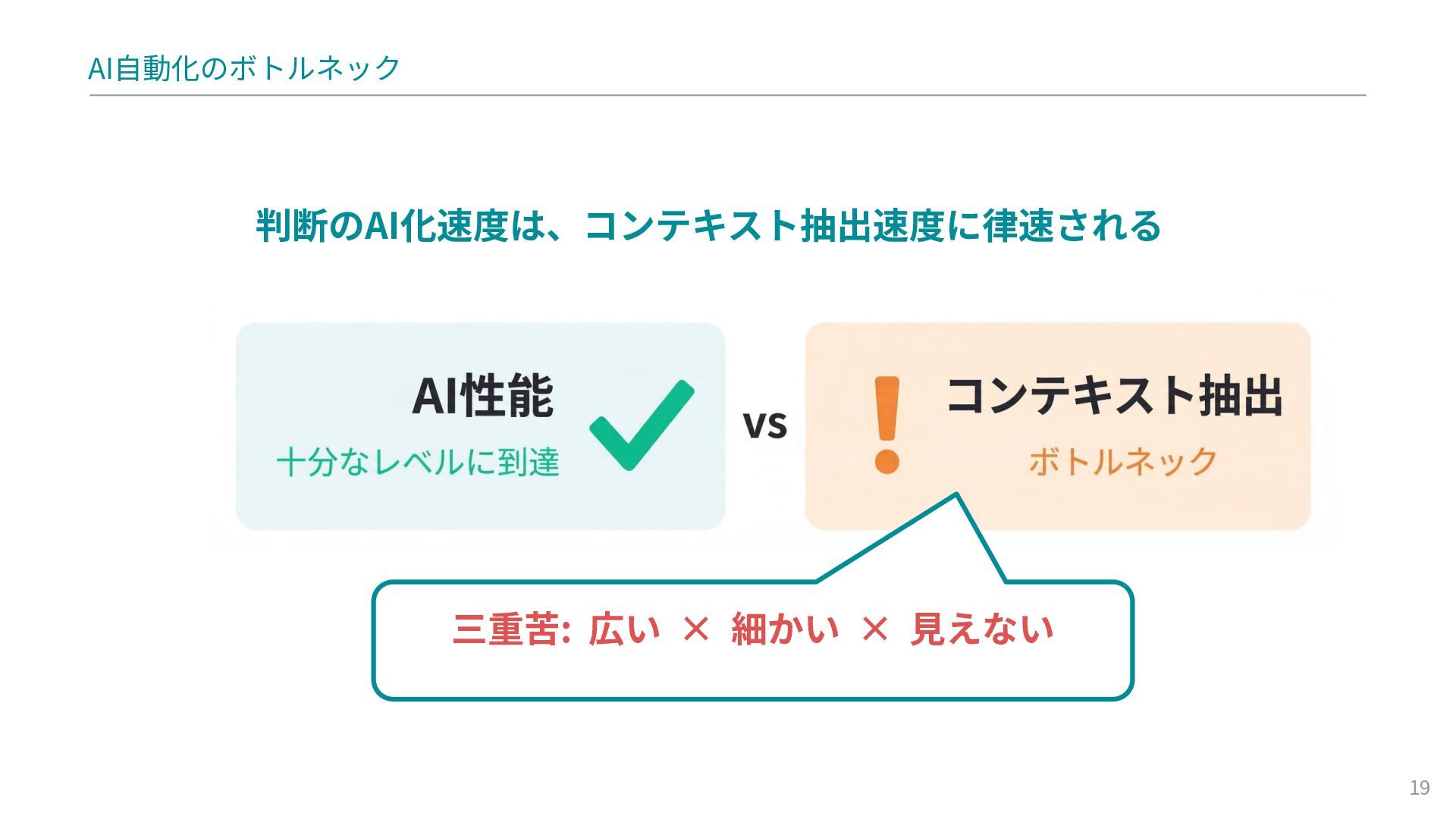 深い自動化の壁: AIの性能向上にも関わらず自動化が難しい理由。ボトルネックとなる「コンテキスト(文脈)抽出」の「広くて、細かくて、見えない」という三重苦