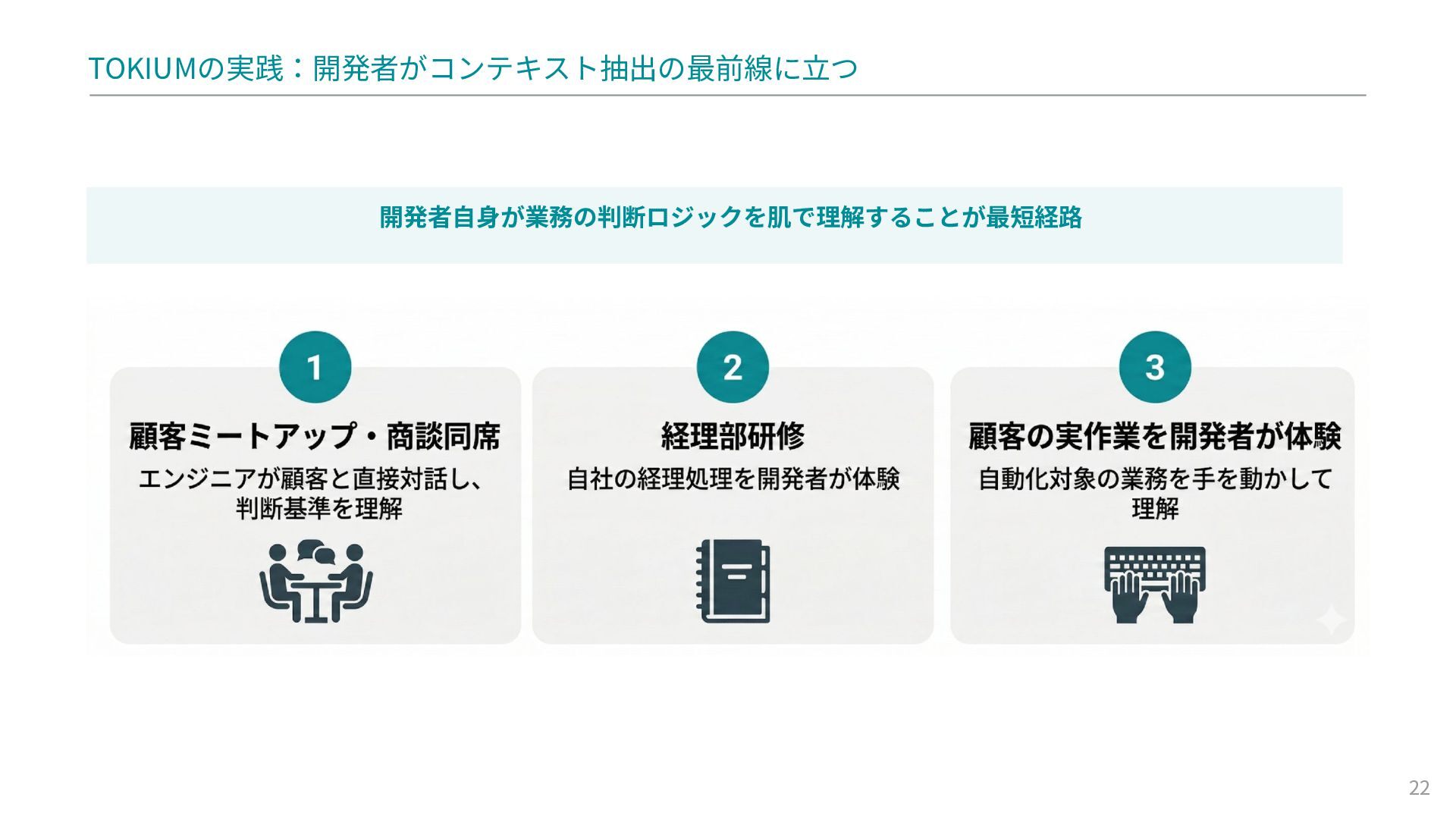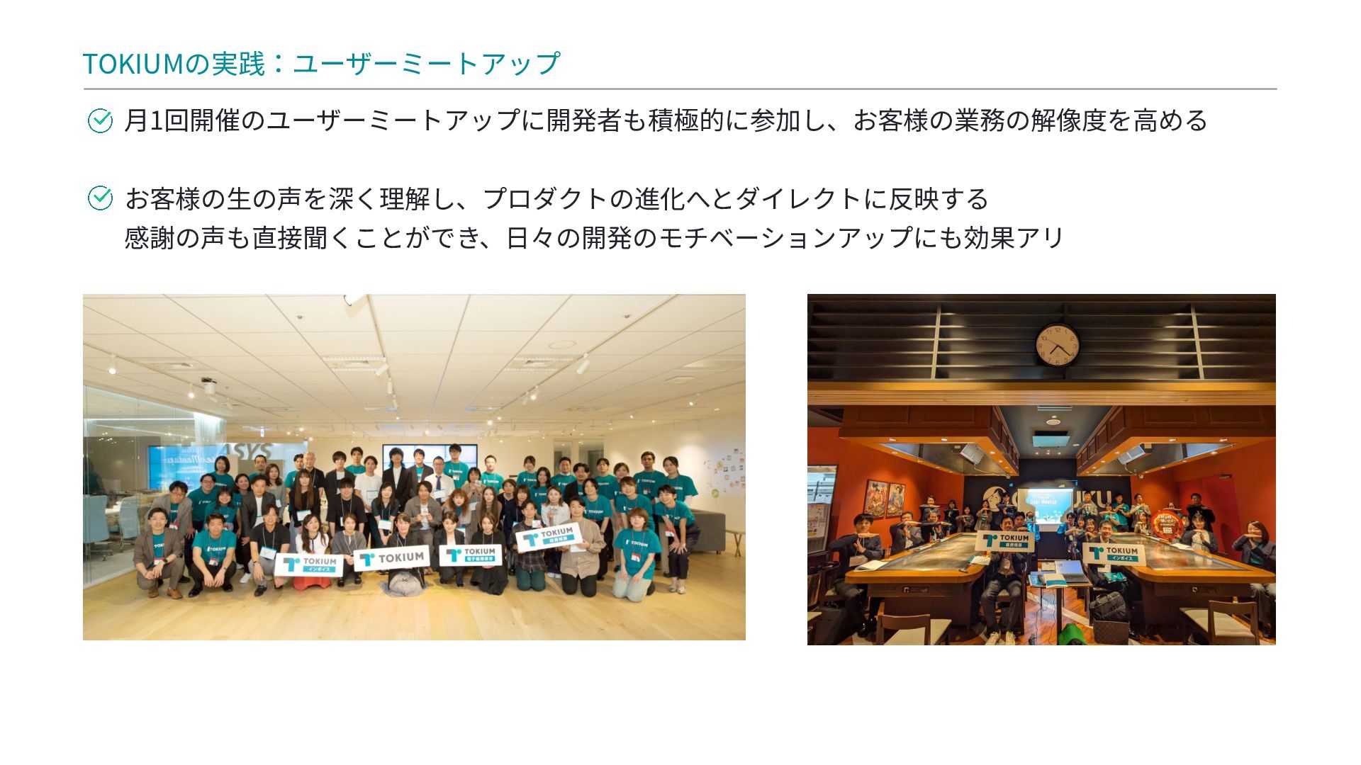 TOKIUMの実践: この壁を乗り越えるため、開発者自身が業務の判断ロジックを理解する最前線に立つ、ユーザーミートアップや経理部研修などの具体的な取り組み