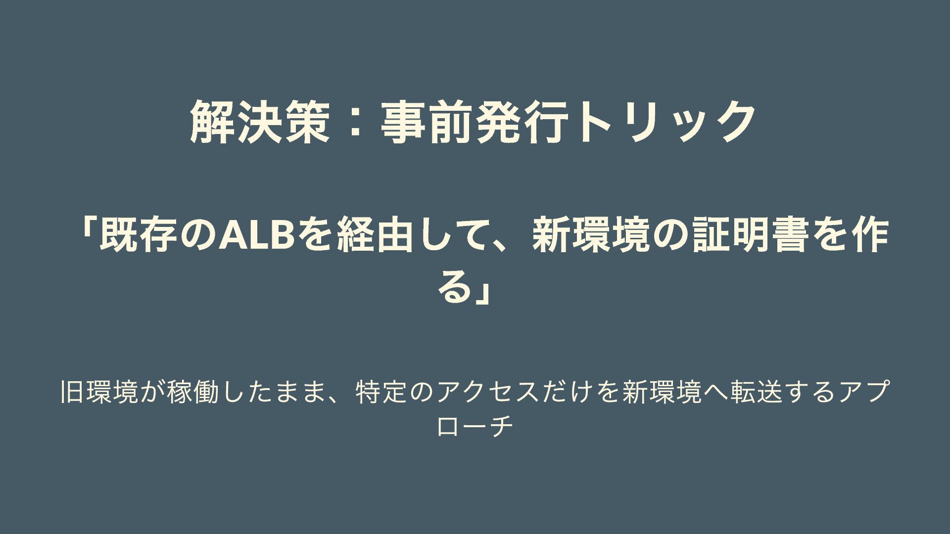 解決策:事前発行トリック 「既存のALB を経由して、新環境の証明書を作 る」 旧環境が稼働したまま、特定のアクセスだけを新環境へ転送するアプ ローチ