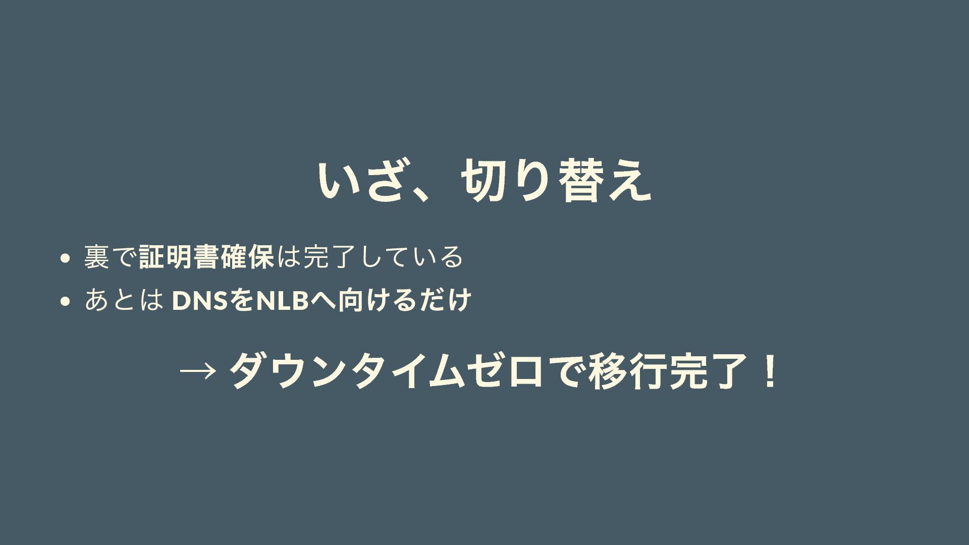 いざ、切り替え 裏で証明書確保は完了している あとは DNS をNLB へ向けるだけ → ダウンタイムゼロで移行完了!