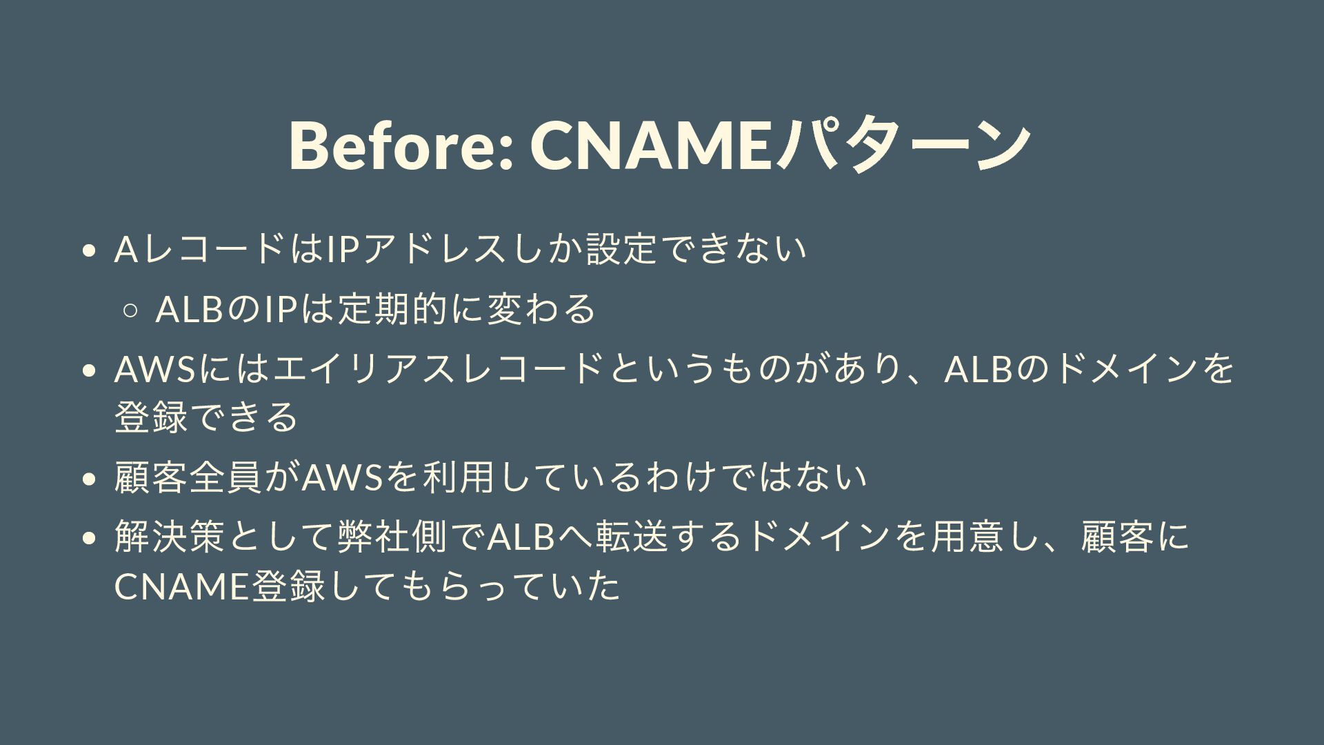 にはエイリアスレコードというものがあり、ALB のドメインを 登録できる 顧客全員がAWS を利用しているわけではない 解決策として弊社側でALB へ転送するドメインを用意し、顧客に CNAME 登録してもらっていた