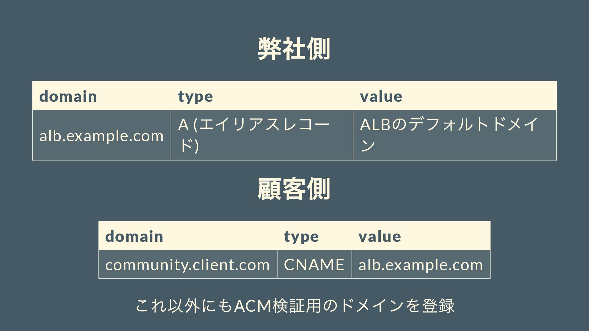のデフォルトドメイ ン 顧客側 domain type value community.client.com CNAME alb.example.com これ以外にもACM 検証用のドメインを登録