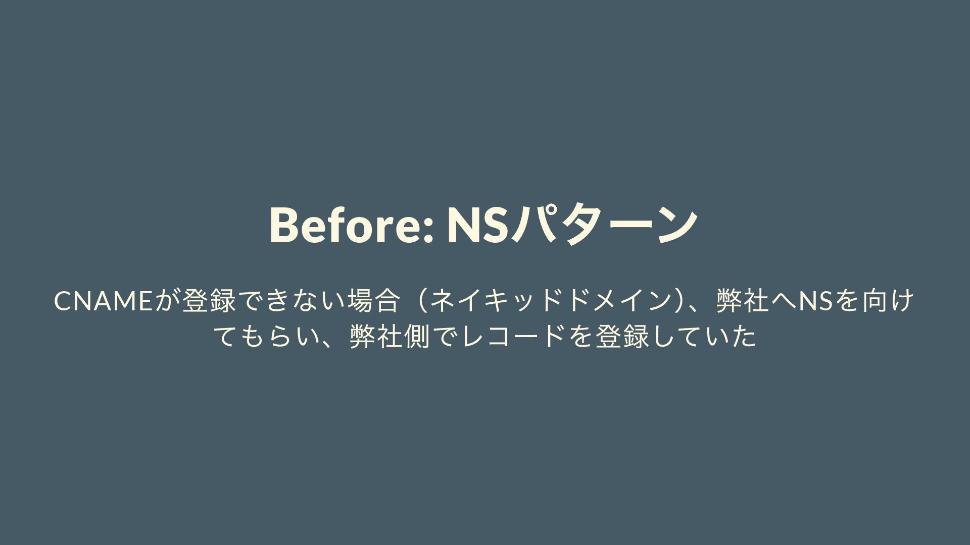 Before: NS パターン CNAME が登録できない場合(ネイキッドドメイン) 、弊社へNS を向け てもらい、弊社側でレコードを登録していた