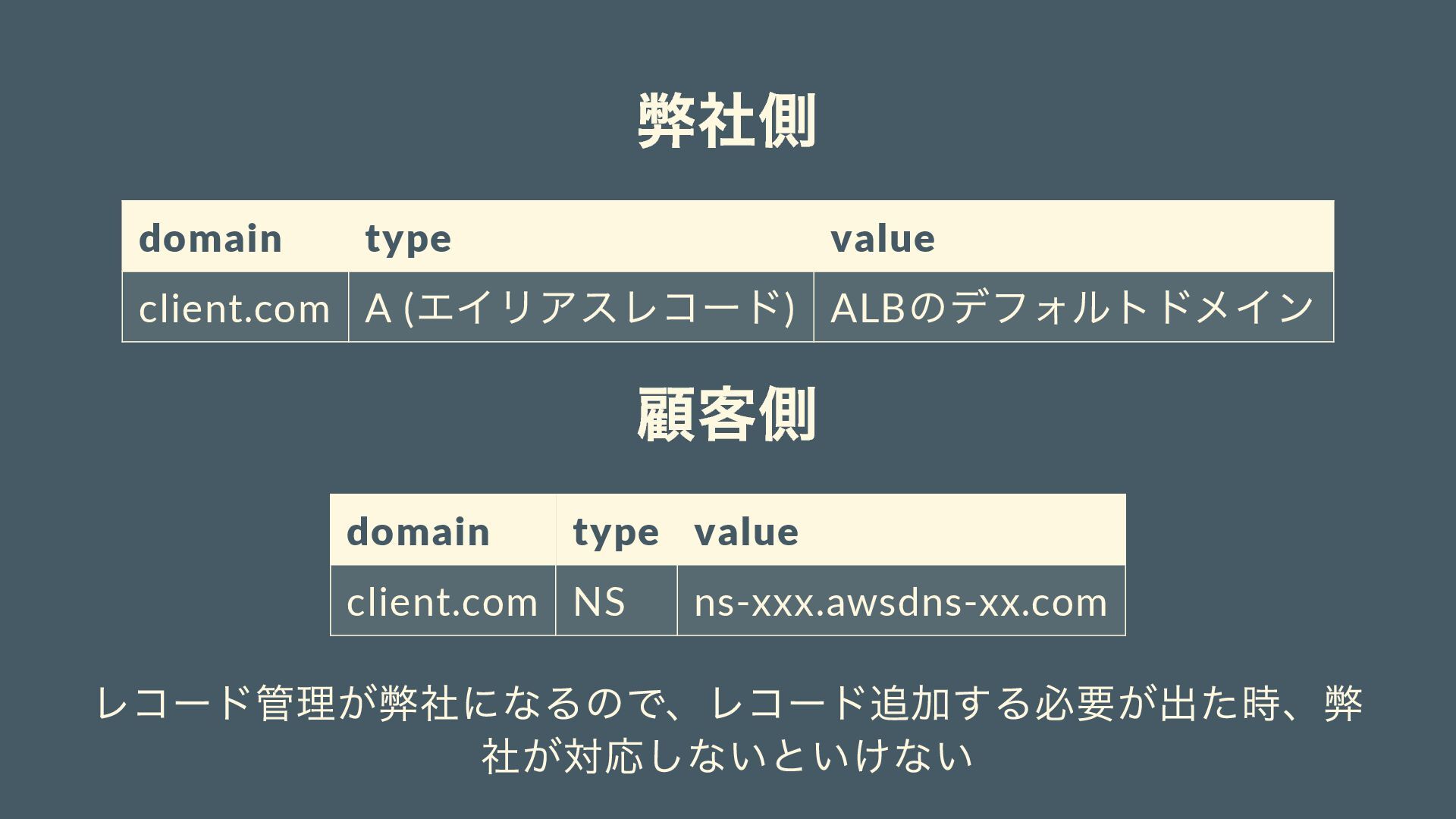 顧客側 domain type value client.com NS ns-xxx.awsdns-xx.com レコード管理が弊社になるので、レコード追加する必要が出た時、弊 社が対応しないといけない
