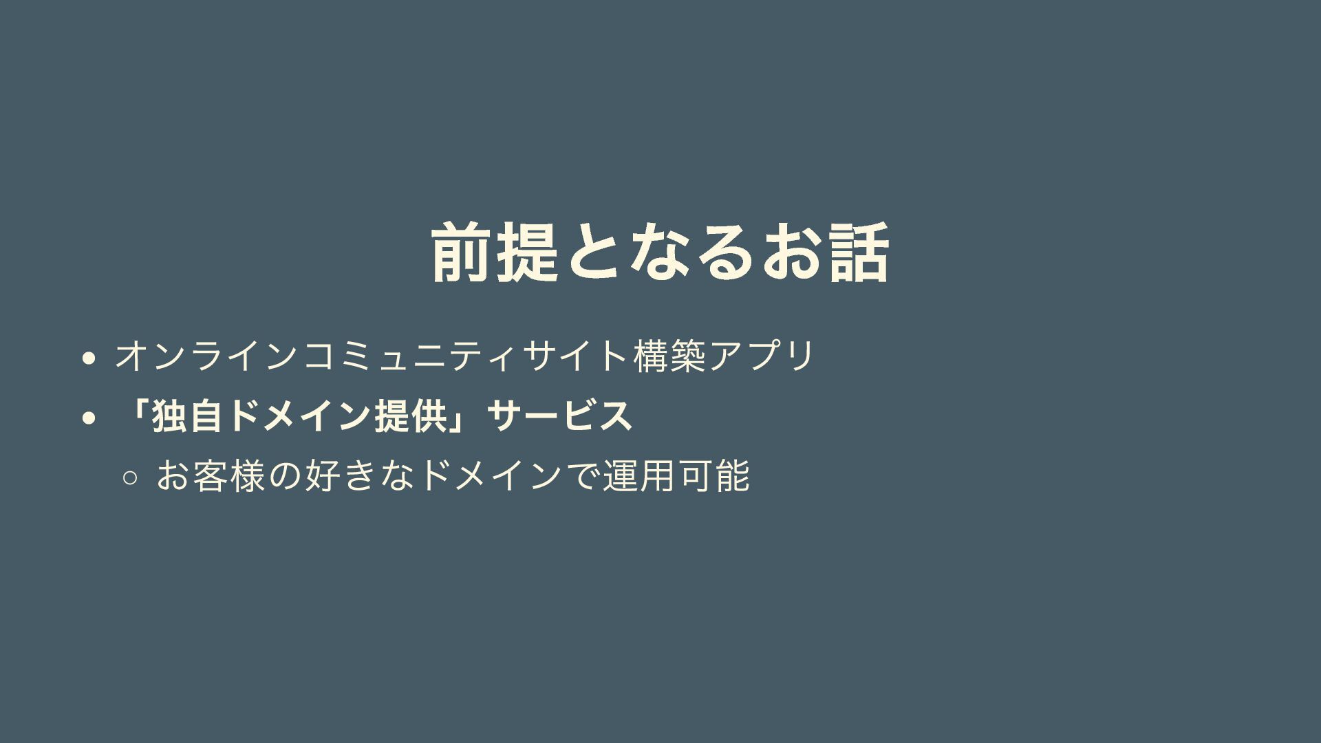 前提となるお話 オンラインコミュニティサイト構築アプリ 「独自ドメイン提供」サービス お客様の好きなドメインで運用可能
