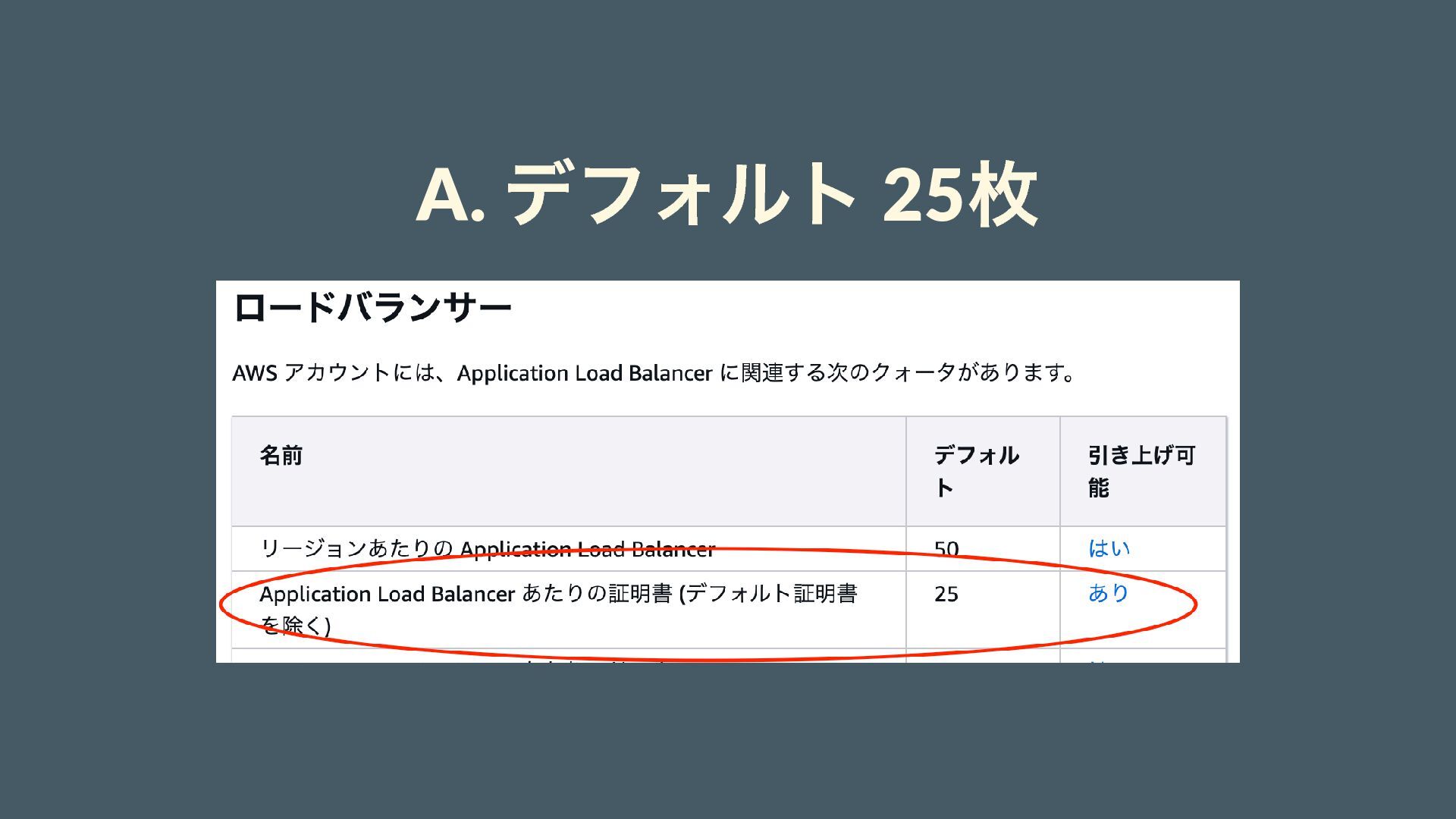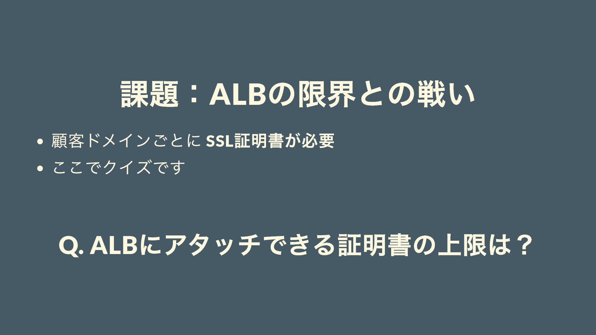 課題:ALB の限界との戦い 顧客ドメインごとに SSL 証明書が必要 ここでクイズです Q. ALB にアタッチできる証明書の上限は?