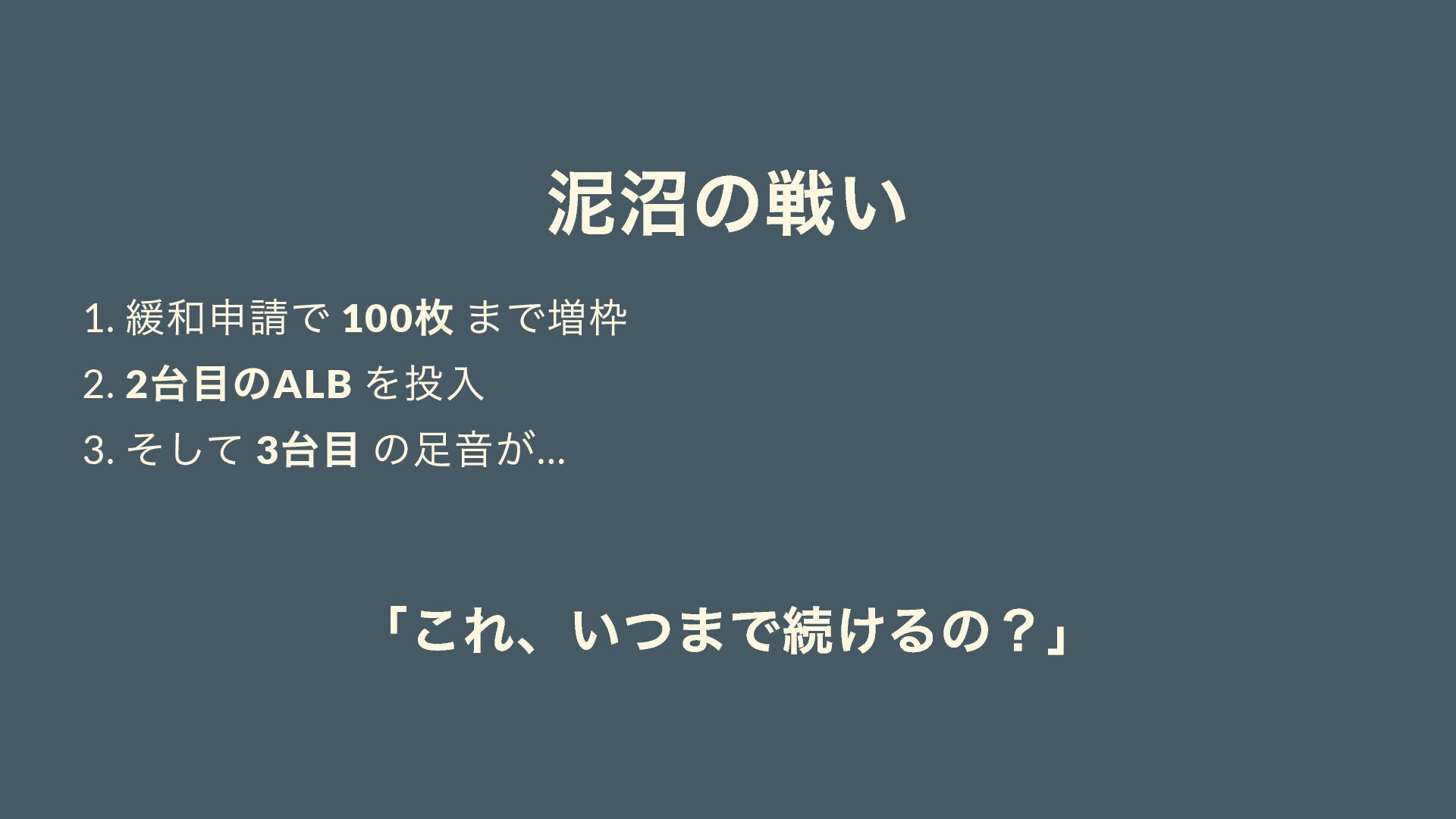 泥沼の戦い 1. 緩和申請で 100 枚 まで増枠 2. 2 台目のALB を投入