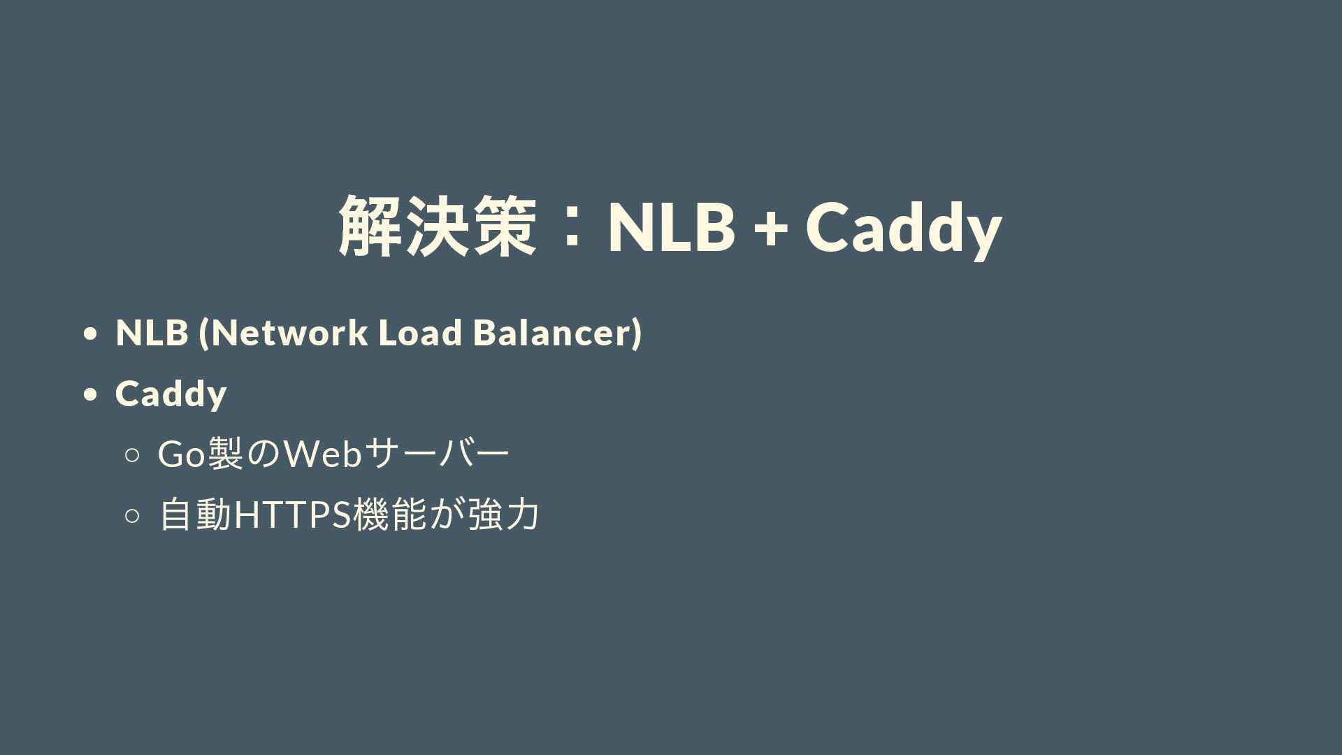 解決策:NLB + Caddy NLB (Network Load Balancer) Caddy Go 製のWeb