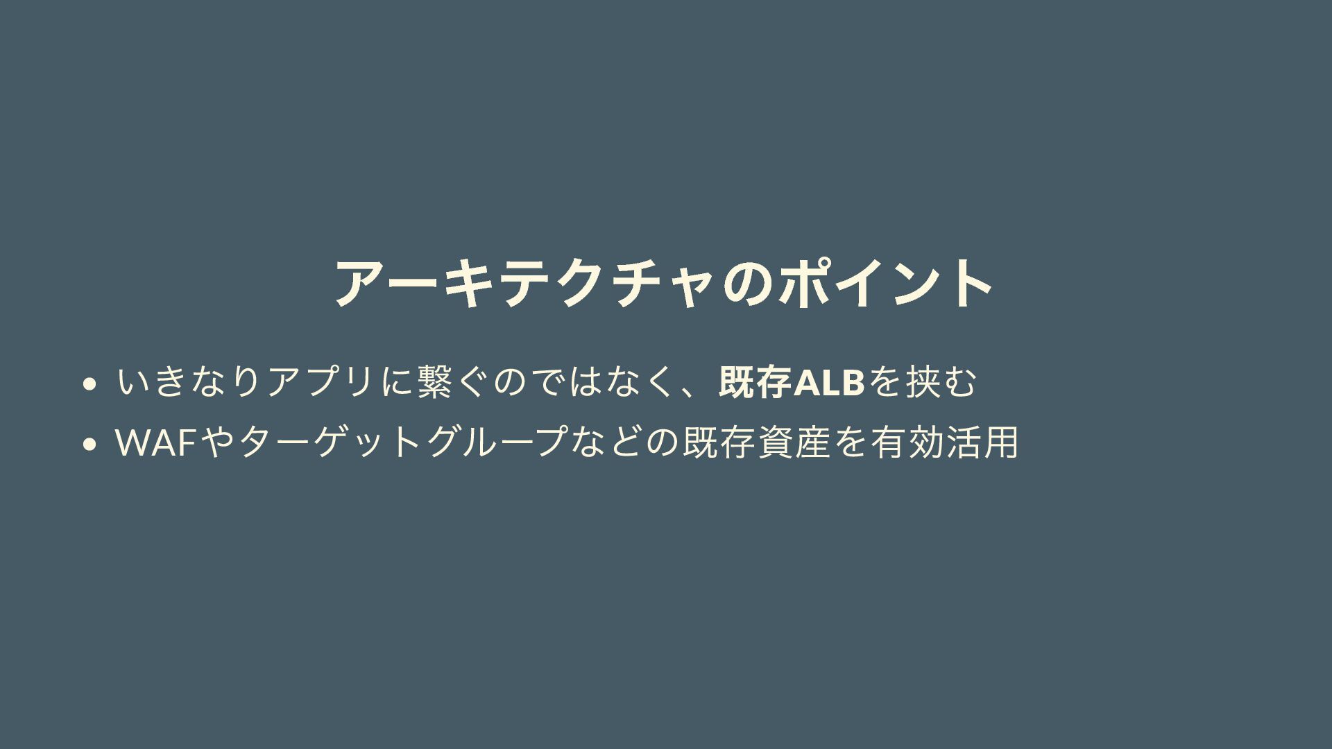 アーキテクチャのポイント いきなりアプリに繋ぐのではなく、既存ALB を挟む WAF やターゲットグループなどの既存資産を有効活用