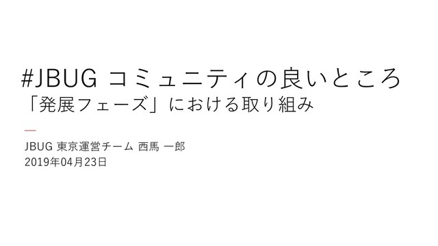 2019/04/23、DevRel/Community #2 にて、#JBUG コミュニティの良いところ 「発展フェーズ」における取り組み を説明させていただきました。 https://devrel.connpass.com/event/124637/