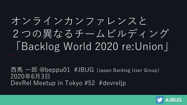 2020-06-03に行われた #devreljp 登壇スライドです。Backlog World 2020 re:Union オンラインについて、チームビルディングとオンラインイベントで工夫した点をはなしました。