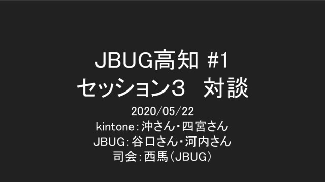 kintone Café 高知 Vol.12 ✕ JBUG高知 #01 のコラボ開催のオンラインイベント。両方のコミュニティの登壇者4人で対談。司会したときのスライド https://jbug.connpass.com/event/172774/ #JBUG高知 #JBUG