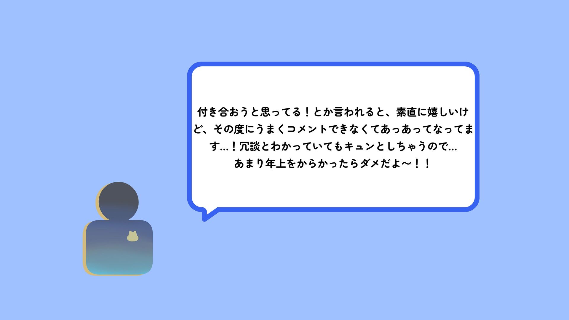 付き合おうと思ってる!とか言われると、素直に嬉しいけ ど、その度にうまくコメントできなくてあっあってなってま す…!冗談とわかっていてもキュンとしちゃうので… あまり年上をからかったらダメだよ〜!!