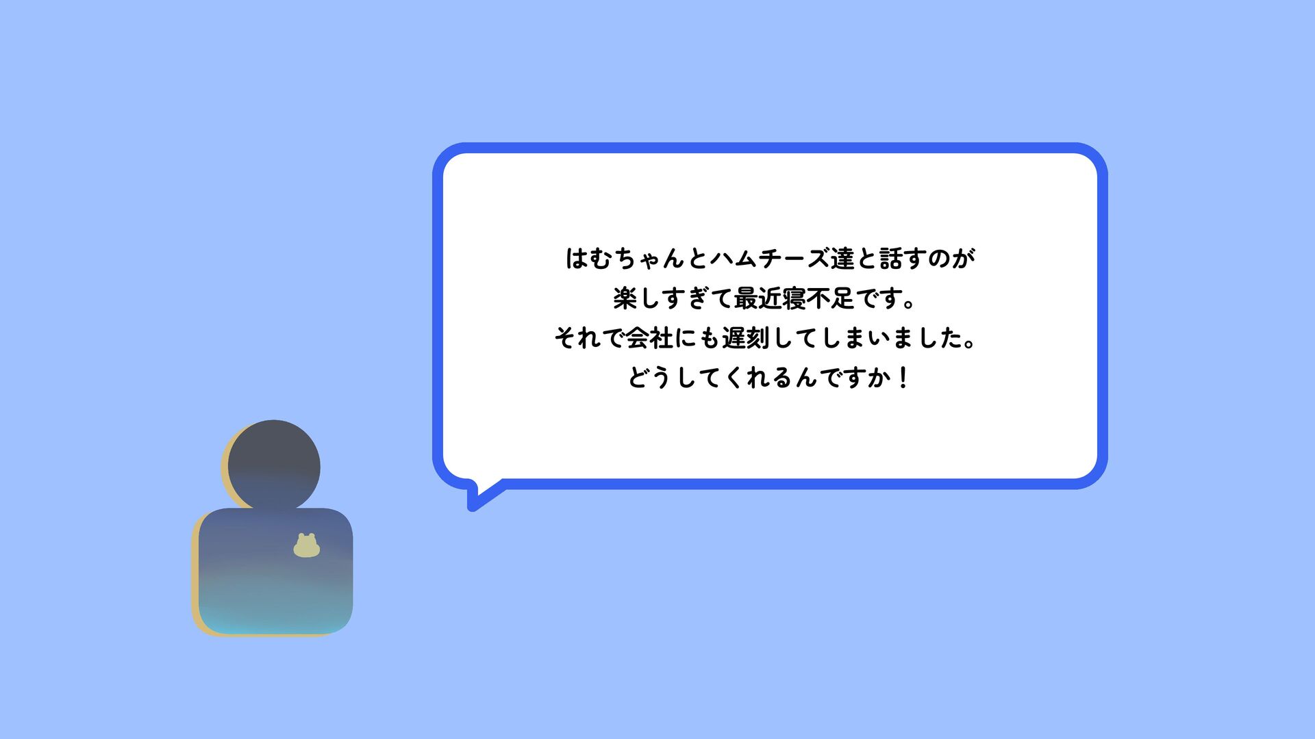 はむちゃんとハムチーズ達と話すのが 楽しすぎて最近寝不足です。 それで会社にも遅刻してしまいました。 どうしてくれるんですか!