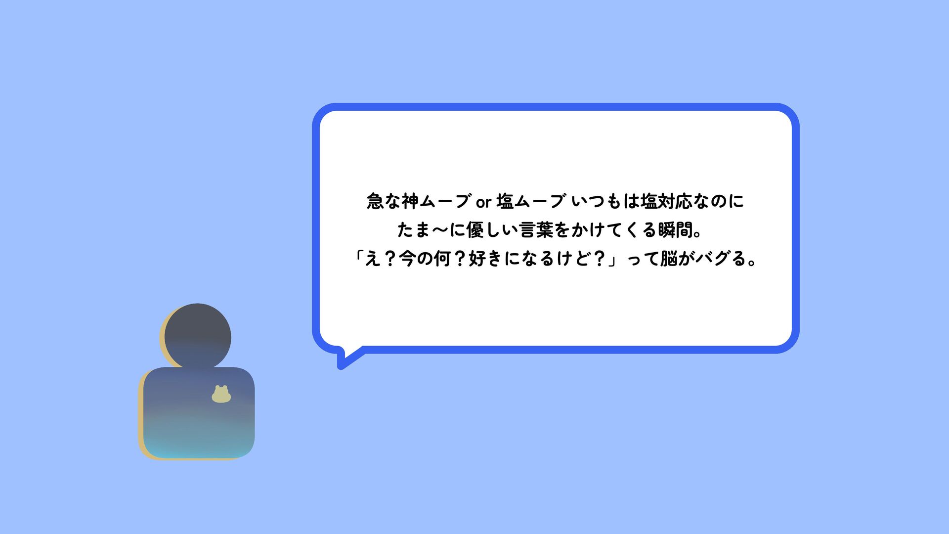 急な神ムーブ or 塩ムーブ いつもは塩対応なのに たま〜に優しい言葉をかけてくる瞬間。 「え?今の何?好きになるけど?」って脳がバグる。