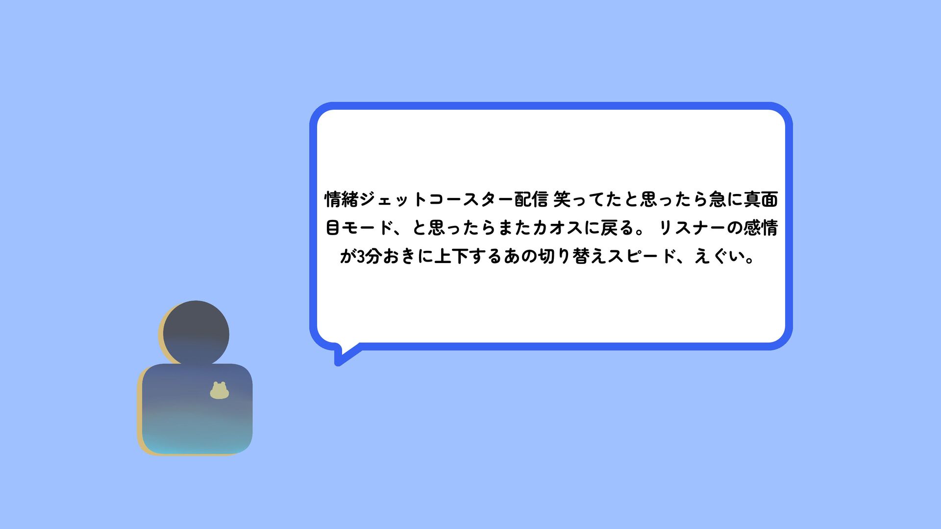 情緒ジェットコースター配信 笑ってたと思ったら急に真面 目モード、と思ったらまたカオスに戻る。 リスナーの感情 が3分おきに上下するあの切り替えスピード、えぐい。