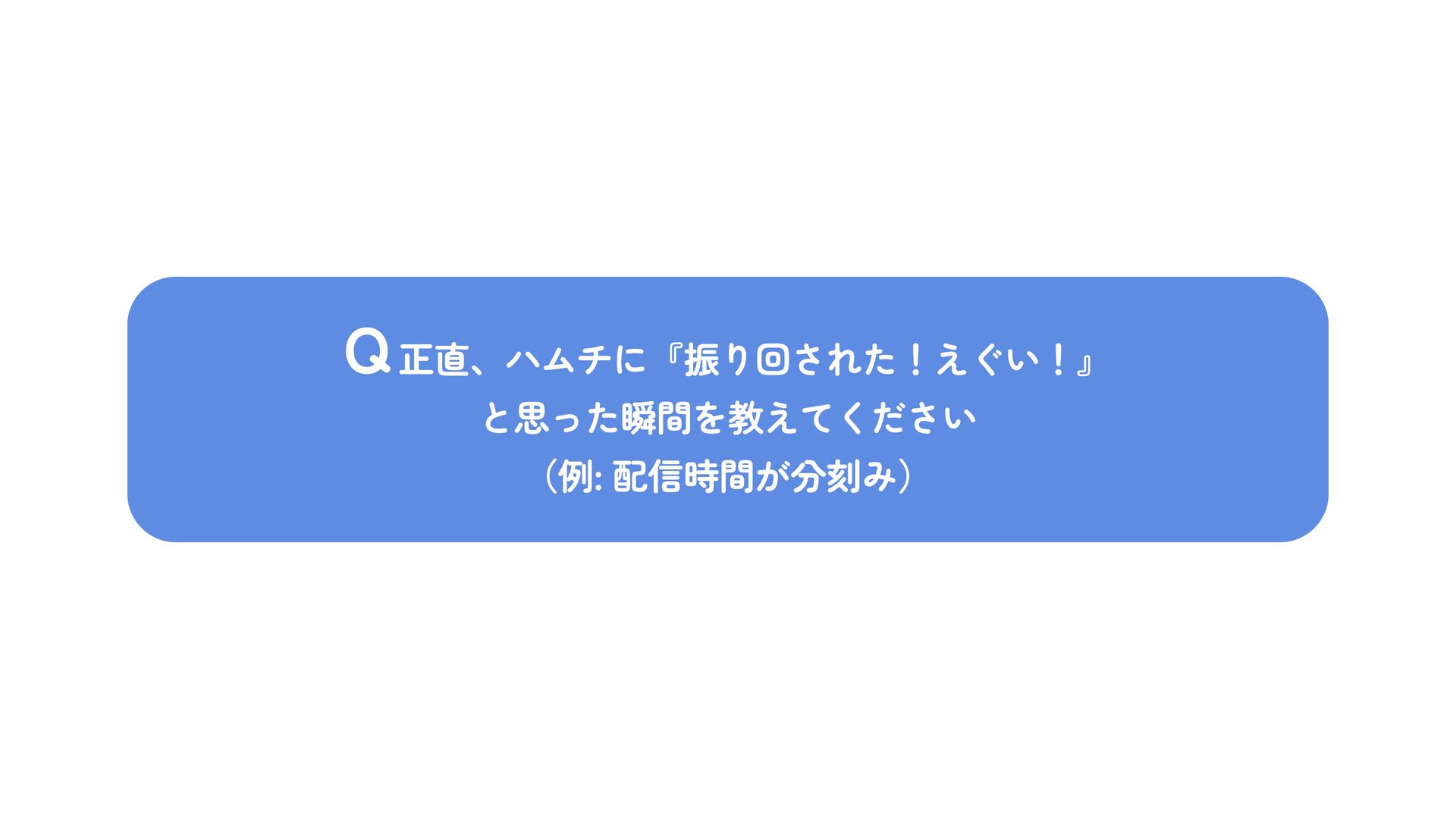 Q 正直、ハムチに『振り回された!えぐい!』 と思った瞬間を教えてください (例: 配信時間が分刻み)