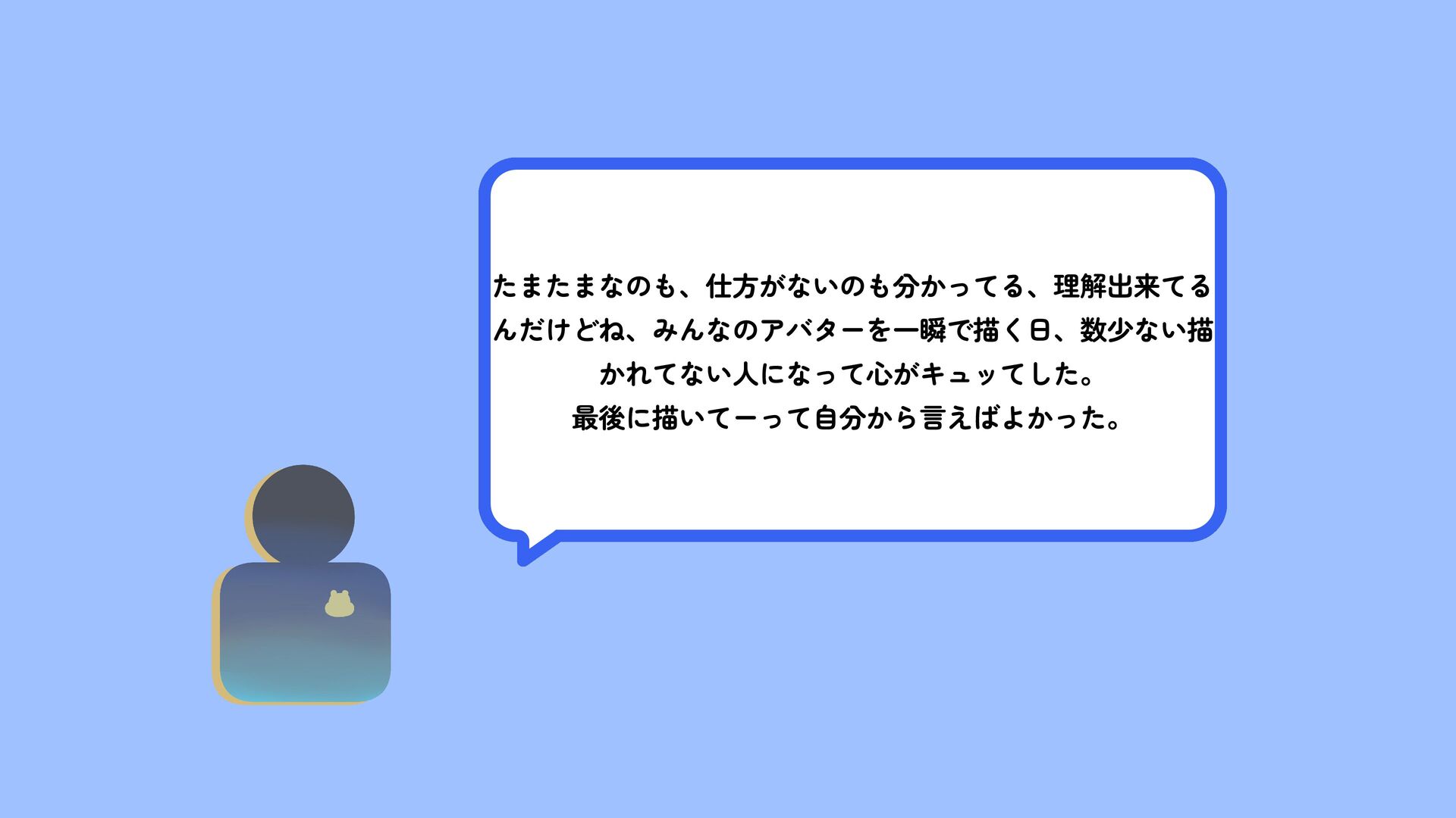 たまたまなのも、仕方がないのも分かってる、理解出来てる んだけどね、みんなのアバターを一瞬で描く日、数少ない描 かれてない人になって心がキュッてした。 最後に描いてーって自分から言えばよかった。