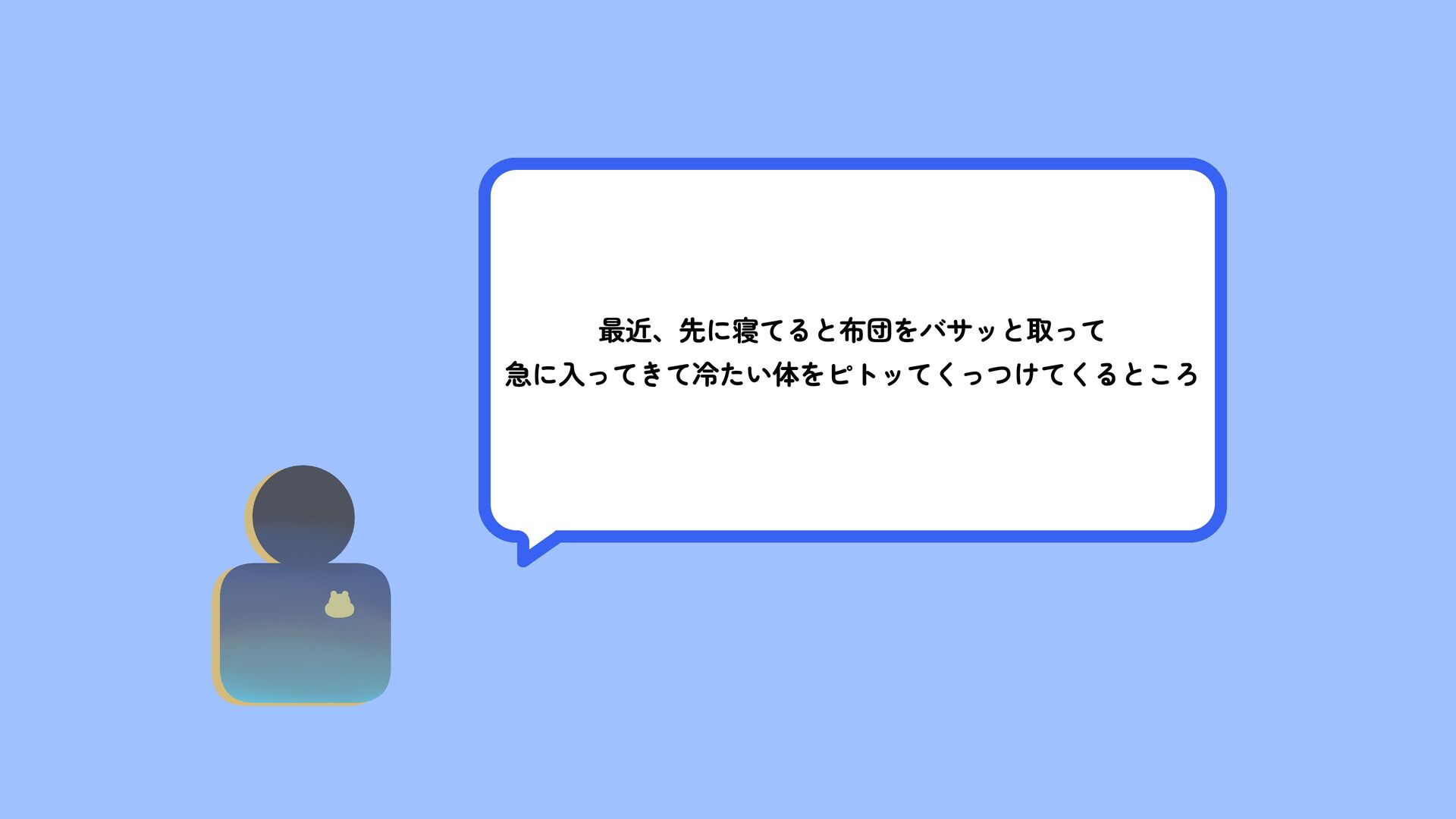 最近、先に寝てると布団をバサッと取って 急に入ってきて冷たい体をピトッてくっつけてくるところ