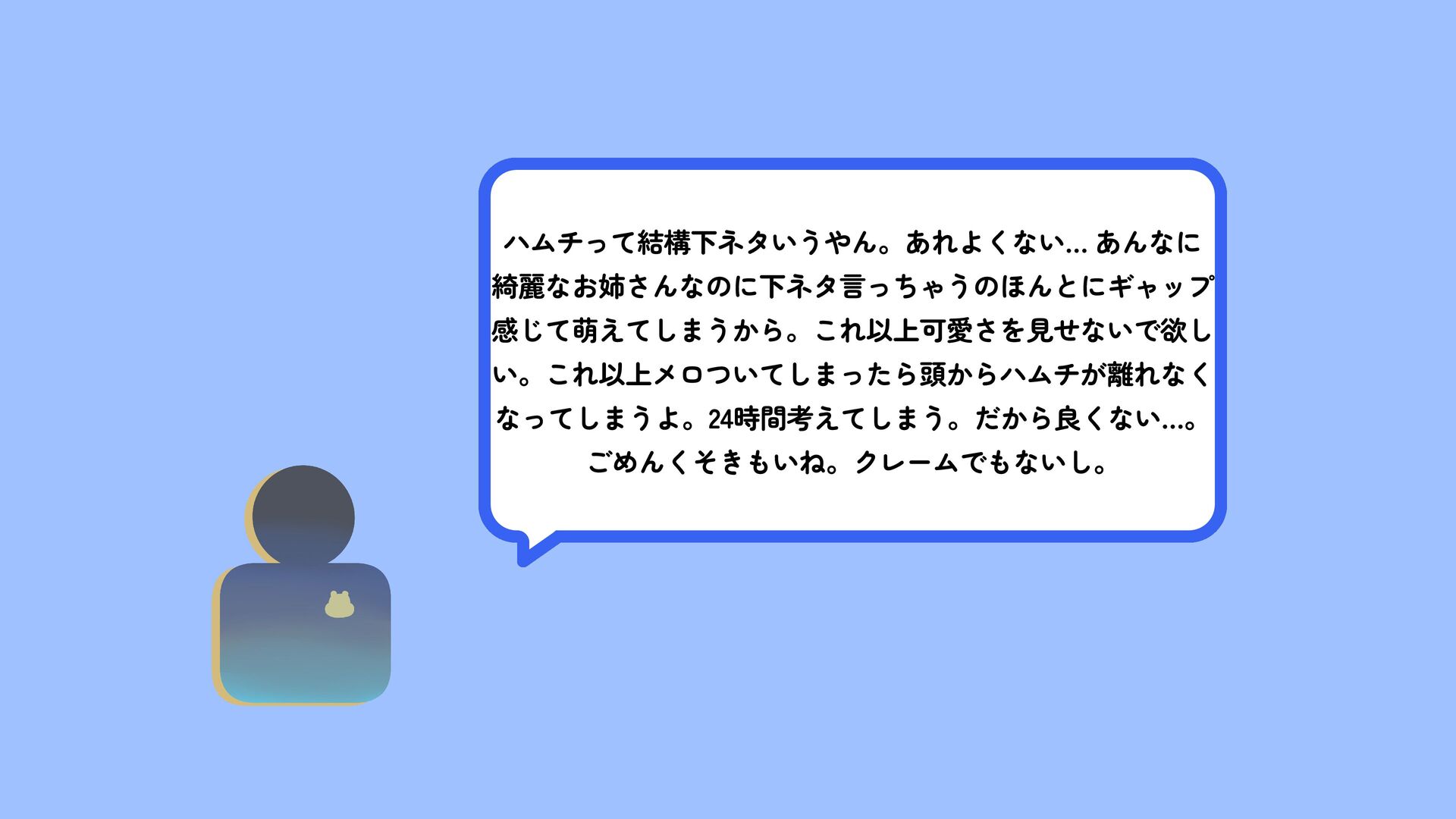 ハムチって結構下ネタいうやん。あれよくない… あんなに 綺麗なお姉さんなのに下ネタ言っちゃうのほんとにギャップ 感じて萌えてしまうから。これ以上可愛さを見せないで欲し い。これ以上メロついてしまったら頭からハムチが離れなく なってしまうよ。24時間考えてしまう。だから良くない…。 ごめんくそきもいね。クレームでもないし。