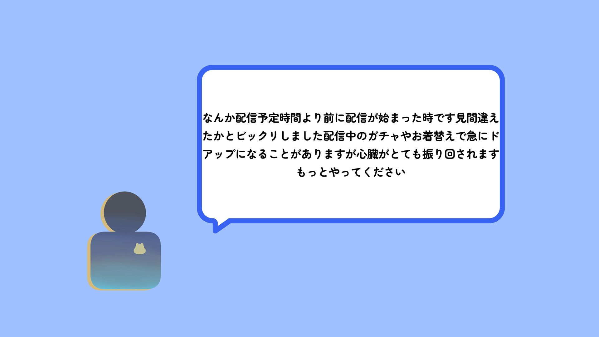 なんか配信予定時間より前に配信が始まった時です見間違え たかとビックリしました配信中のガチャやお着替えで急にド アップになることがありますが心臓がとても振り回されます もっとやってください