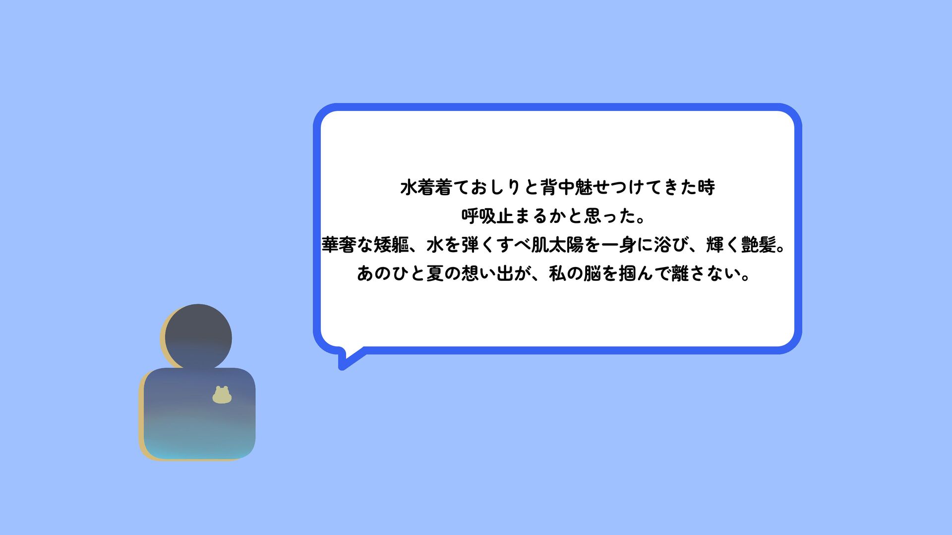 水着着ておしりと背中魅せつけてきた時 呼吸止まるかと思った。 華奢な矮軀、水を弾くすべ肌太陽を一身に浴び、輝く艶髪。 あのひと夏の想い出が、私の脳を掴んで離さない。