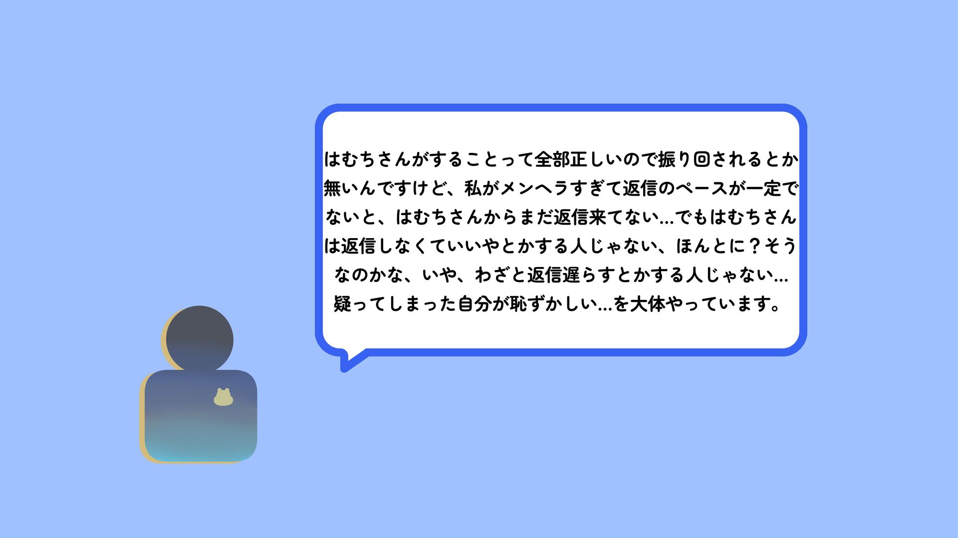 はむちさんがすることって全部正しいので振り回されるとか 無いんですけど、私がメンヘラすぎて返信のペースが一定で ないと、はむちさんからまだ返信来てない…でもはむちさん は返信しなくていいやとかする人じゃない、ほんとに?そう なのかな、いや、わざと返信遅らすとかする人じゃない… 疑ってしまった自分が恥ずかしい…を大体やっています。