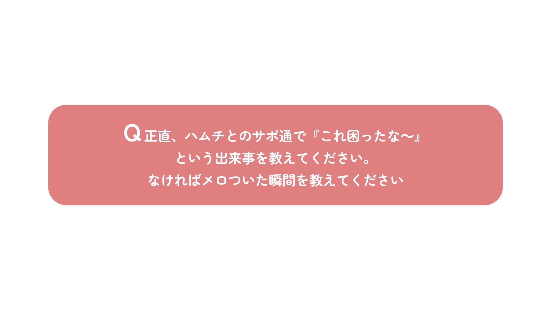 Q 正直、ハムチとのサポ通で『これ困ったな~』 という出来事を教えてください。 なければメロついた瞬間を教えてください