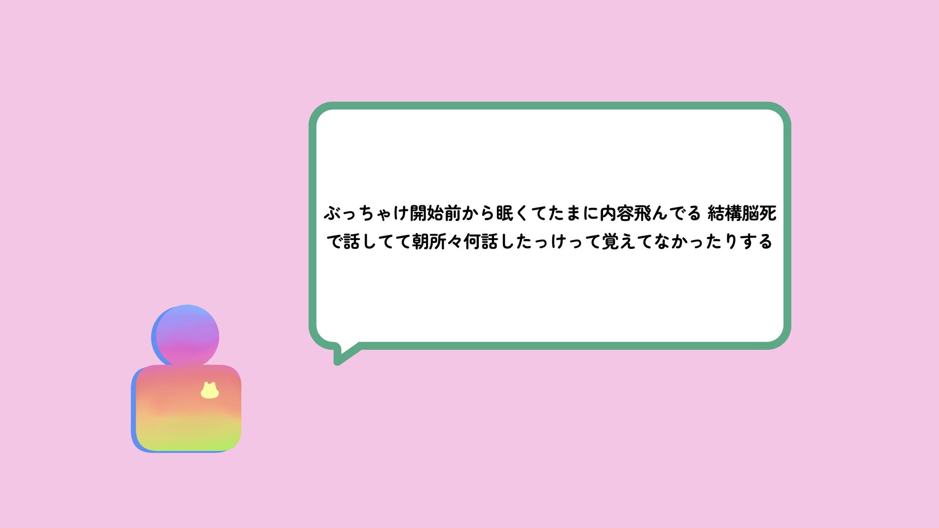 ぶっちゃけ開始前から眠くてたまに内容飛んでる 結構脳死 で話してて朝所々何話したっけって覚えてなかったりする