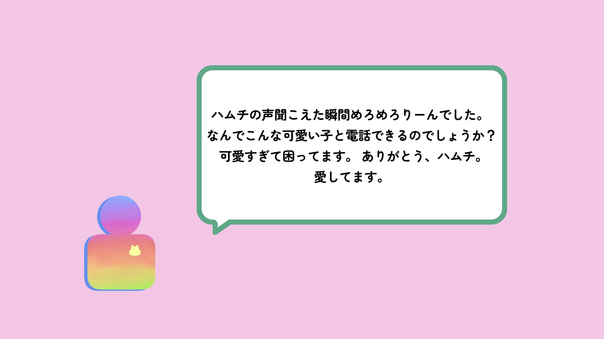 ハムチの声聞こえた瞬間めろめろりーんでした。 なんでこんな可愛い子と電話できるのでしょうか? 可愛すぎて困ってます。 ありがとう、ハムチ。 愛してます。