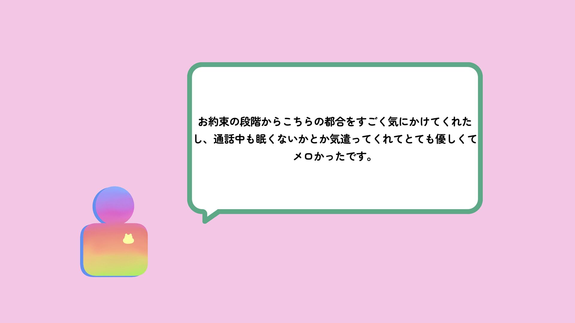 お約束の段階からこちらの都合をすごく気にかけてくれた し、通話中も眠くないかとか気遣ってくれてとても優しくて メロかったです。