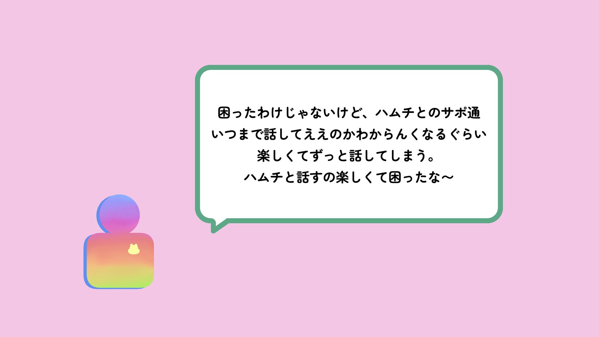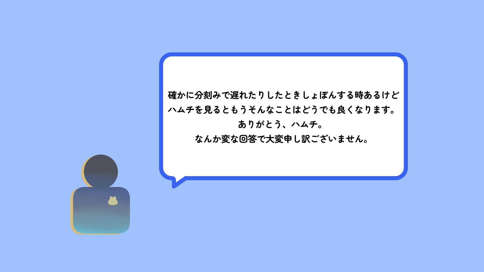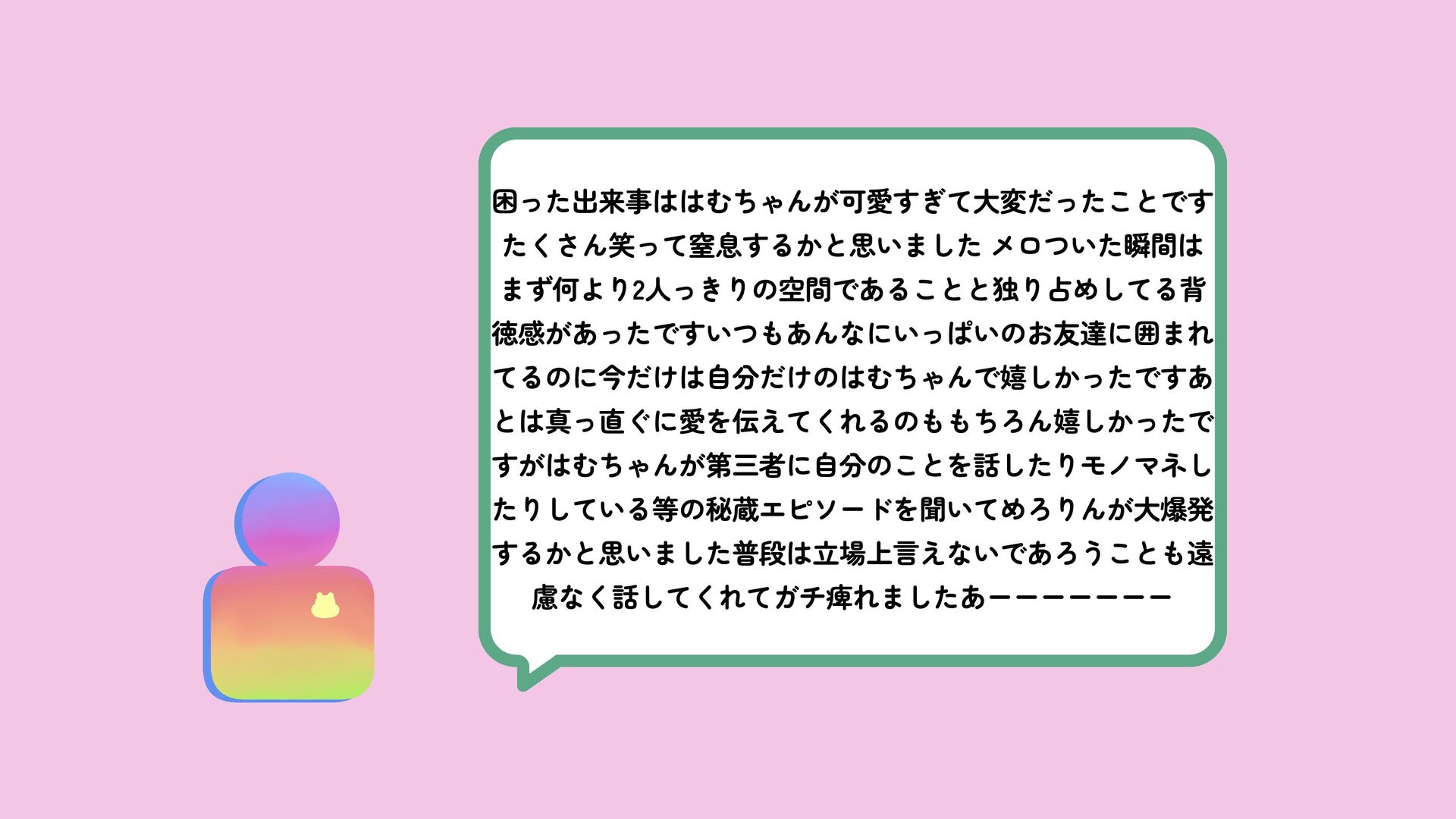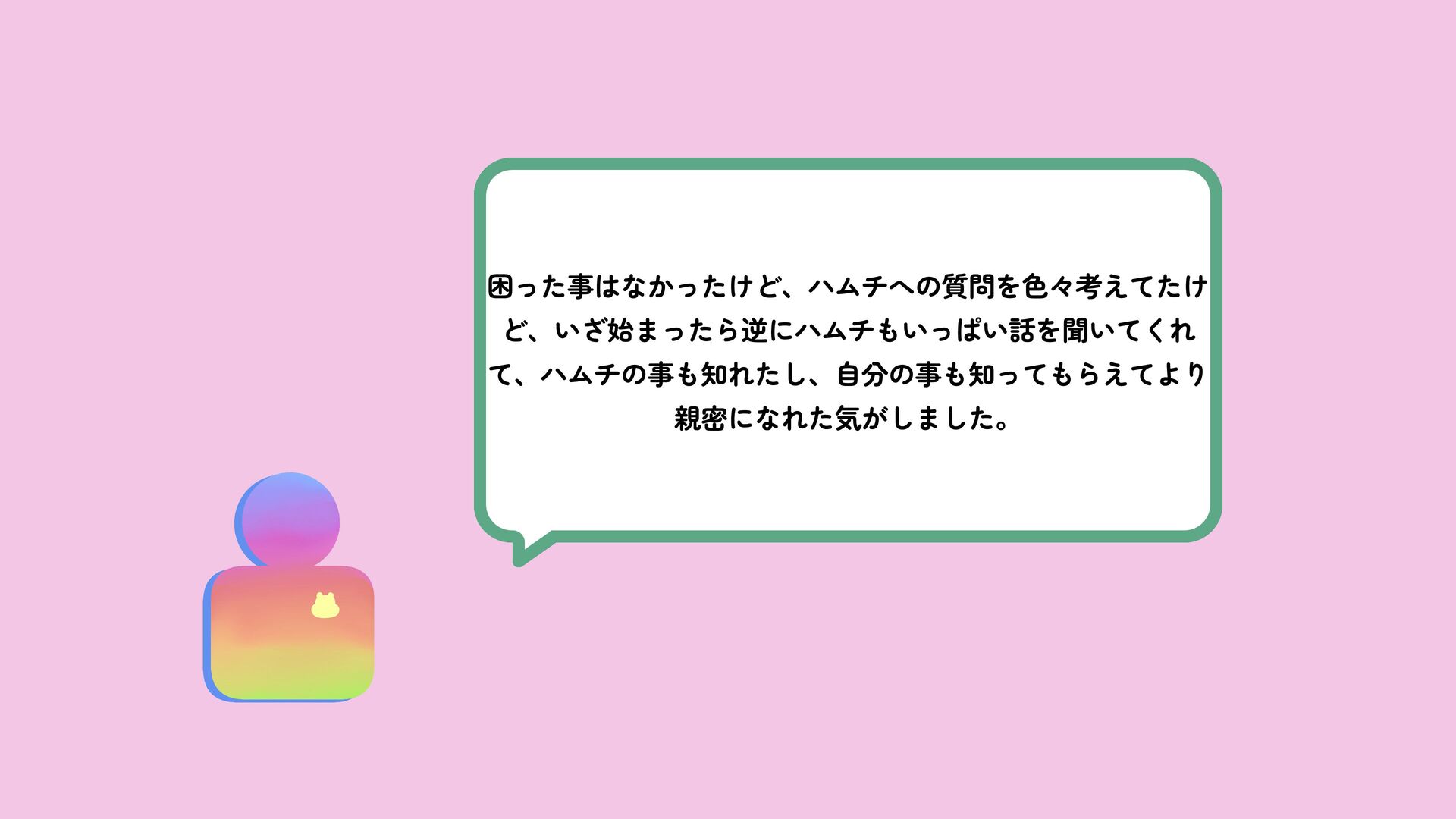 困った事はなかったけど、ハムチへの質問を色々考えてたけ ど、いざ始まったら逆にハムチもいっぱい話を聞いてくれ て、ハムチの事も知れたし、自分の事も知ってもらえてより 親密になれた気がしました。