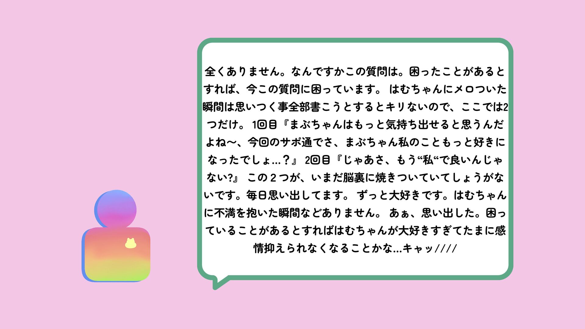 全くありません。なんですかこの質問は。困ったことがあると すれば、今この質問に困っています。 はむちゃんにメロついた 瞬間は思いつく事全部書こうとするとキリないので、ここでは2 つだけ。 1回目『まぶちゃんはもっと気持ち出せると思うんだ よね〜、今回のサポ通でさ、まぶちゃん私のこともっと好きに なったでしょ…?』 2回目『じゃあさ、もう“私“で良いんじゃ ない?』