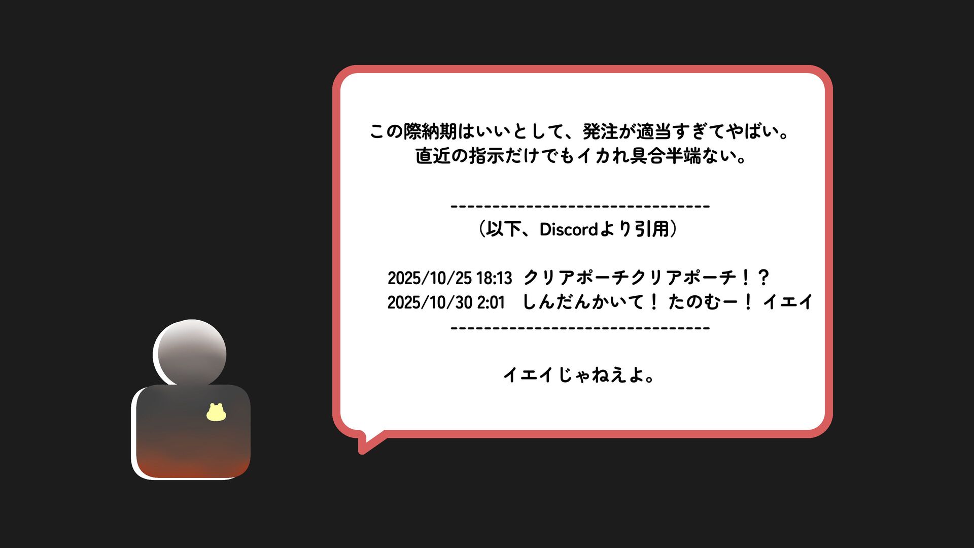 この際納期はいいとして、発注が適当すぎてやばい。 直近の指示だけでもイカれ具合半端ない。 ------------------------------- (以下、Discordより引用) 2025/10/25 18:13 クリアポーチクリアポーチ!? 2025/10/30 2:01 しんだんかいて!