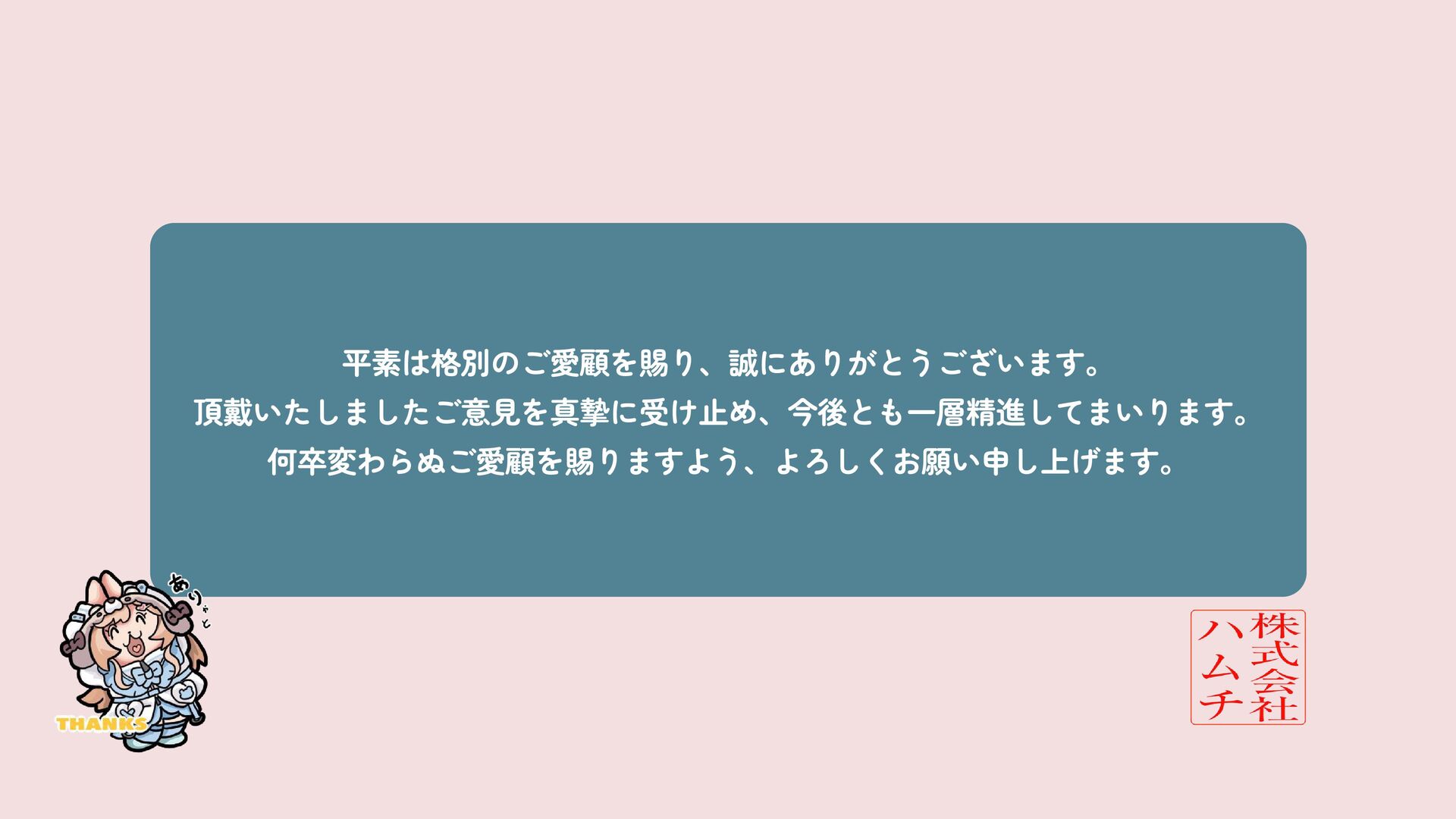 平素は格別のご愛顧を賜り、誠にありがとうございます。 頂戴いたしましたご意見を真摯に受け止め、今後とも一層精進してまいります。 何卒変わらぬご愛顧を賜りますよう、よろしくお願い申し上げます。