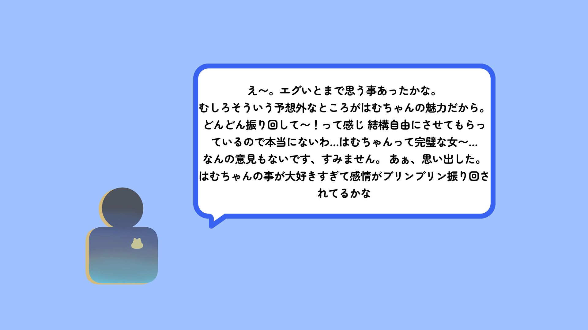 え〜。エグいとまで思う事あったかな。 むしろそういう予想外なところがはむちゃんの魅力だから。 どんどん振り回して〜!って感じ 結構自由にさせてもらっ ているので本当にないわ…はむちゃんって完璧な女〜… なんの意見もないです、すみません。 あぁ、思い出した。 はむちゃんの事が大好きすぎて感情がブリンブリン振り回さ れてるかな