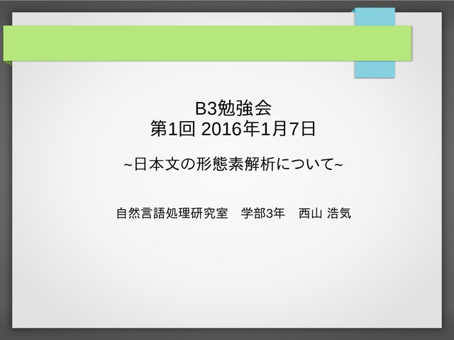 B3勉強会 第1回 2016年1月7日 ~日本文の形態素解析について~ 自然言語処理研究室 学部3年 西山 浩気