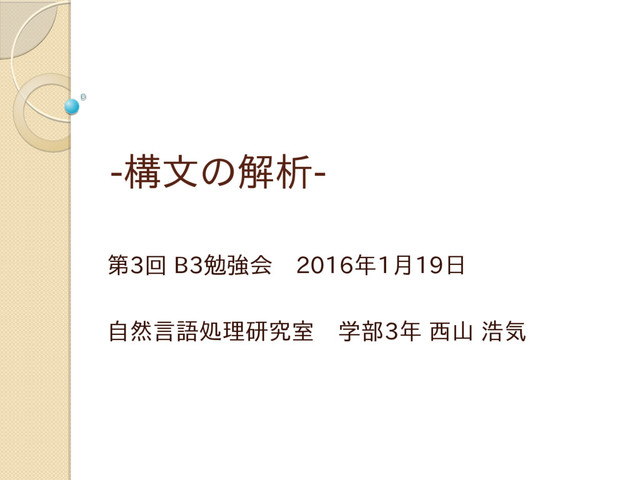 -構文の解析- 第3回 B3勉強会 2016年1月19日 自然言語処理研究室 学部3年 西山 浩気