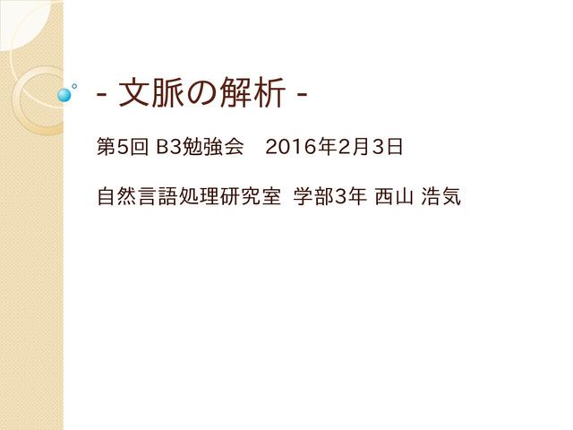 - 文脈の解析 - 第5回 B3勉強会 2016年2月3日 自然言語処理研究室 学部3年 西山 浩気